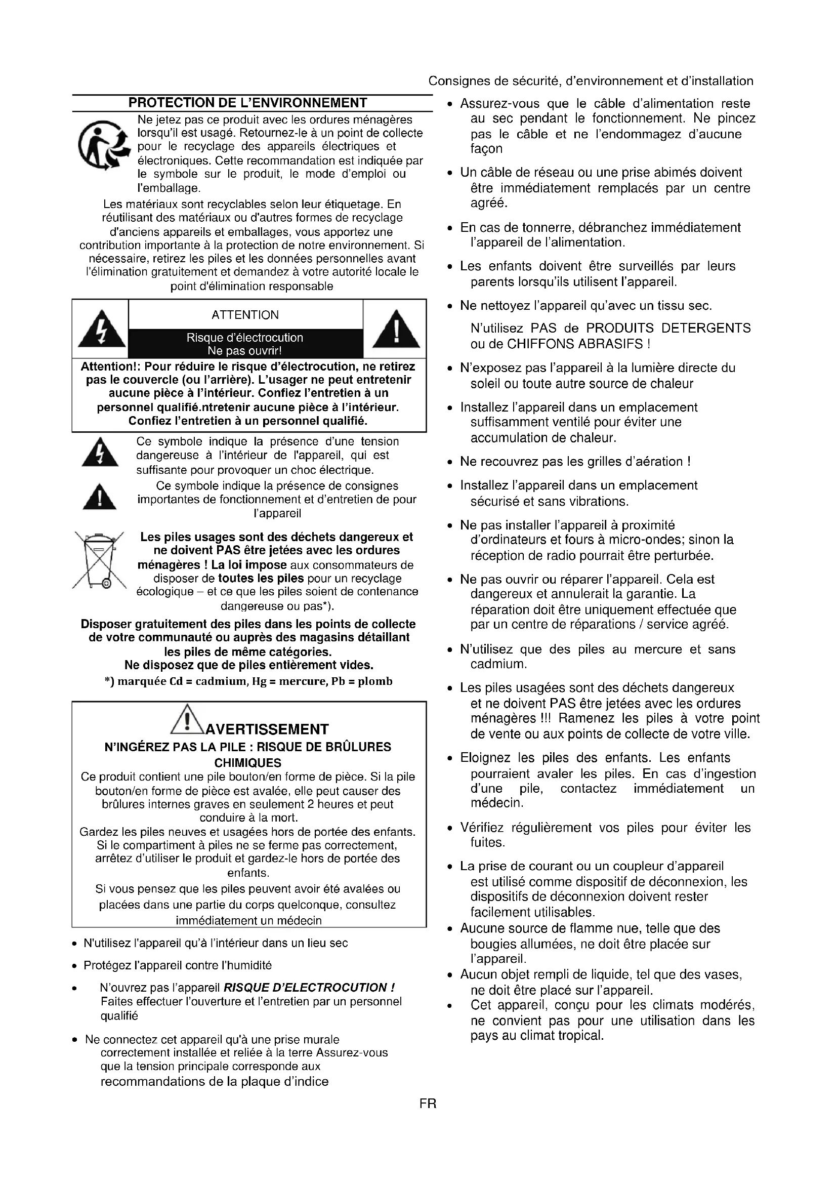 Disposer gratuitement des piles dans les points de collecte de votre communauté ou auprès des magasins détaillant les piles de même catégories. Ne disposez que de piles entièrement vides. *) marquée Cd = cadmium, Hg = mercure, Pb = plomb