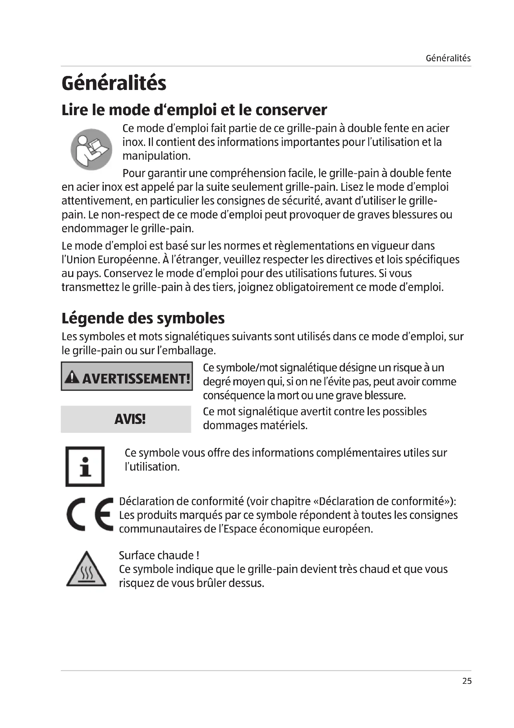 Généralités Lire le mode d‘emploi et le conserver Ce mode d’emploi fait partie de ce grille-pain à double fente en acier inox. Il contient des informations importantes pour l’utilisation et la manipulation. Pour garantir une compréhension facile, le grille-pain à double fente en acier inox est appelé par la suite seulement grille-pain. Lisez le mode d’emploi attentivement, en particulier les consignes de sécurité, avant d’utiliser le grille- pain. Le non-respect de ce mode d’emploi peut provoquer de graves blessures ou endommager le grille-pain. Le mode d’emploi est basé sur les normes et règlementations en vigueur dans l’Union Européenne. À l’étranger, veuillez respecter les directives et lois spécifiques au pays. Conservez le mode d’emploi pour des utilisations futures. Si vous transmettez le grille-pain à des tiers, joignez obligatoirement ce mode d’emploi. Légende des symboles Les symboles et mots signalétiques suivants sont utilisés dans ce mode d’emploi, sur le grille-pain ou sur l’emballage. AVERTISSEMENT! Ce symbole/mot signalétique désigne un risque à un degré moyen qui, si on ne l’évite pas, peut avoir comme conséquence la mort ou une grave blessure. AVIS! Ce mot signalétique avertit contre les possibles dommages matériels. Ce symbole vous offre des informations complémentaires utiles sur l’utilisation. Déclaration de conformité (voir chapitre «Déclaration de conformité»): Les produits marqués par ce symbole répondent à toutes les consignes communautaires de l’Espace économique européen. Surface chaude ! Ce symbole indique que le grille-pain devient très chaud et que vous risquez de vous brûler dessus.Sécurité