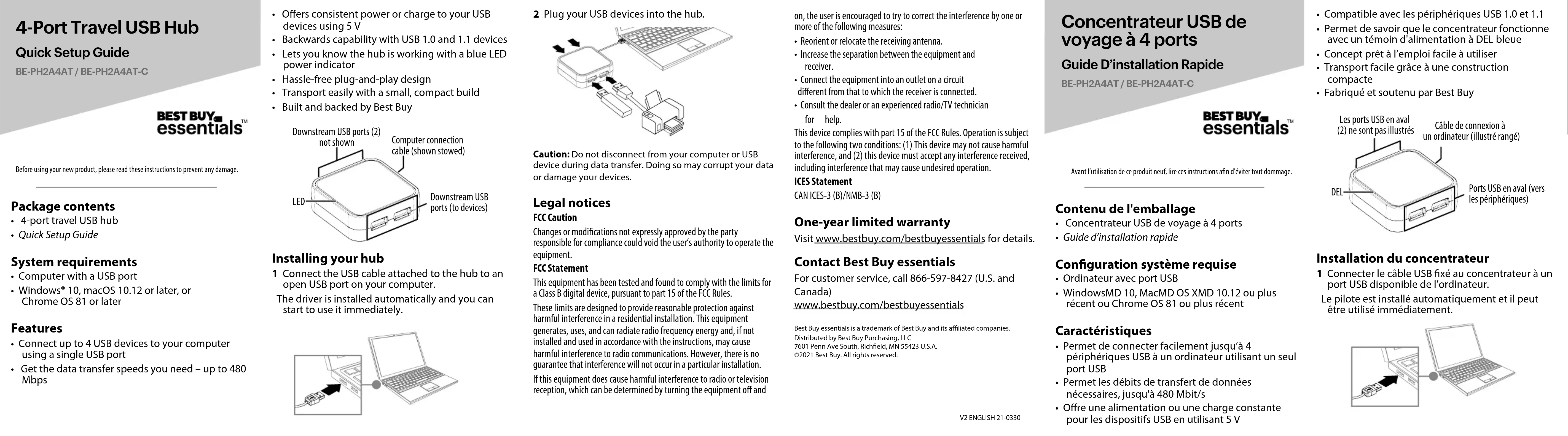 Flat size: 12 × 5 in. (304.8 × 127 mm) Folded size: 3 × 5 in. (76.2 × 127 mm) BE-PH2A4AT_21-0330_QSG_V2_EN FR SP.ai 1 3/31/2021 11:11:00 AMBE-PH2A4AT_21-0330_QSG_V2_EN FR SP.ai 1 3/31/2021 11:11:00 AM2 Brancher les périphériques USB sur le concentrateur. Attention : Ne pas le déconnecter de l'ordinateur ou du périphérique USB pendant le transfert de données. Sinon, une perte de données peut en résulter et les périphériques pourraient être endommagés. Avis juridiques Avertissement FCC Tous changements ou modications qui ne seraient pas expressément approuvés par les responsables des normes pourraient rendre nul le droit de l’utilisateur d’utiliser cet équipement. Déclaration de la FCC Cet équipement a été testé et déclaré conforme aux limitations prévues dans le cadre de la catégorie B des appareils numériques, dénies par l’article 15 du règlement de la FCC. Ces limites ont été établies pour fournir une protection raisonnable contre les interférences préjudiciables lors d’une installation résidentielle. Cet équipement génère, utilise et diuse des ondes radio et, s’il n’est pas installé et utilisé conformément aux instructions dont il fait l’objet, il peut provoquer des interférences préjudiciables aux communications radio. Cependant, il n'est pas possible de garantir qu’aucune interférence ne se produira pour une installation particulière. Si cet équipement produit des interférences préjudiciables lors de Contenido del paquete