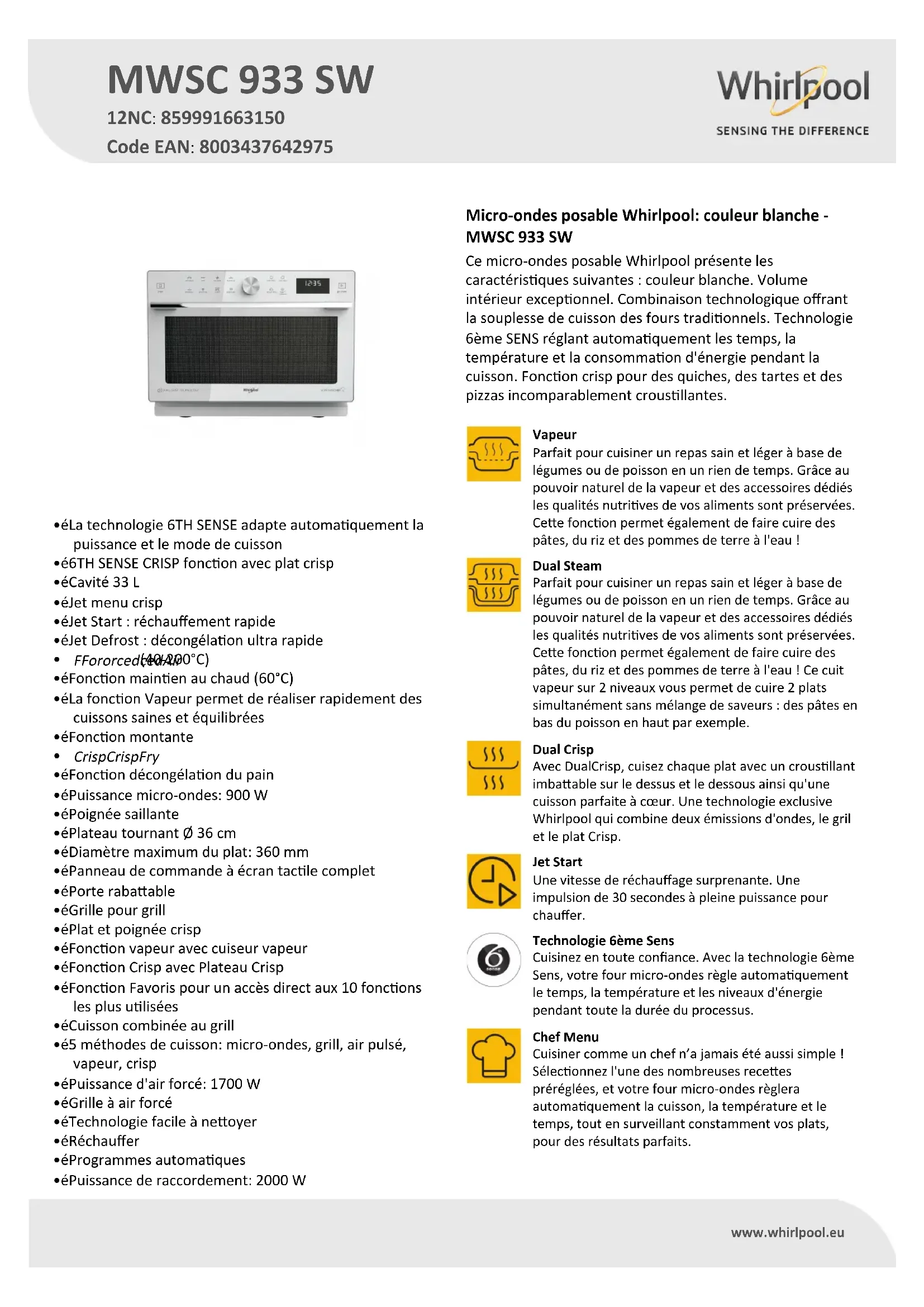 Retrouvez gratuitement la notice de l'appareil MWSC 933 SW WHIRLPOOL au format PDF.