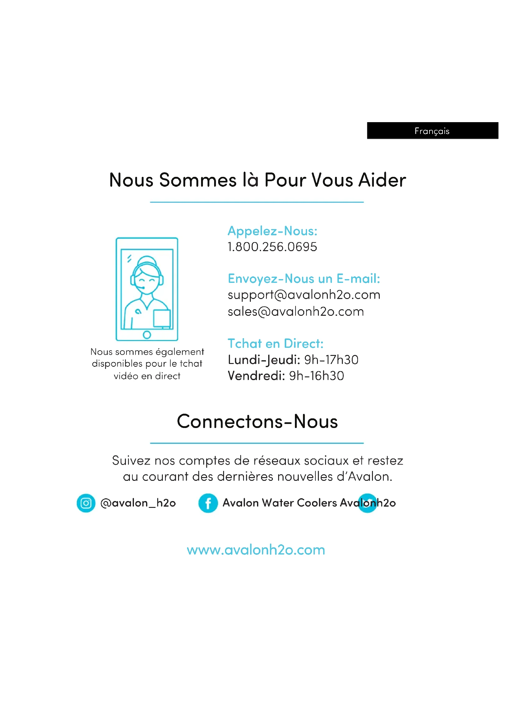 Les produits ennumérés ci-dessus sont couverts par les termes de cette garantie limite. Aux fins de cette garantie limite, le terme «produit» désigne tout refroidisseur d'eau un bouteille ou sans bouteille fabrique pour Avalon. Avalon garantit qu'elle remplorecau au reparerau, au choix d'Avalon, le produit Avalon de l'acheteur vendu aux Etats-Unis ou a Canada par un detaillant autorisé si ce produit est defecteux en raison d'un detaif de fabrication ou de matériaux, sous réserve des limitations décrits dans cette garantie limitée. Avalon décline toute responsabilité quant à la qualite des marchandises, sauf indication contraire dans cette garantie. Il n'y a aucune garantie qui s'estendau-delà de la description au recontré des prinsenles. Cette garantie limiteré n'est valable que dans le cadre de l'achat initial de nouveaux produits aproups de détaillants autorisés et s'estendau-partir de la date d'achat originale du produit original cheté. Cette garantie s'applique uniquement à l'acheteur original du produit et dur une (1) an a compter de la date de l'achat initiau ou jusqu'à ce que l'acheteur original du produit vende ou transfere le produit, selon la première éventualité. Un «acheteur d'origine», aux fins de la presente garantie limitée, est une personne physique ou morale qui achete le produit directement après d'Avalon ou d'un detaillant autorisé d'Avalon avec l'intention d'utiliser le produit à des fins personnelles ou commerciales ou avec l'intention de revendre le produit. Un «detaillant autorisé», aux fins de cette garantie limitée, est une personne ou une entité autorisée par Avalon à vendre le produit directement aux cheaterurs originaux. Un individu ou une entité qui achete le produit de qu'elle source que ce soit dans l'intention de revendre le produit est un revendeur non autorisé («revendeur non autorisé'). Aux fins de cette garantie limite, un «tiers» sera considéré comme un plombier, une entreprise d'entretien ou une personne embauchée par l'acheteur.