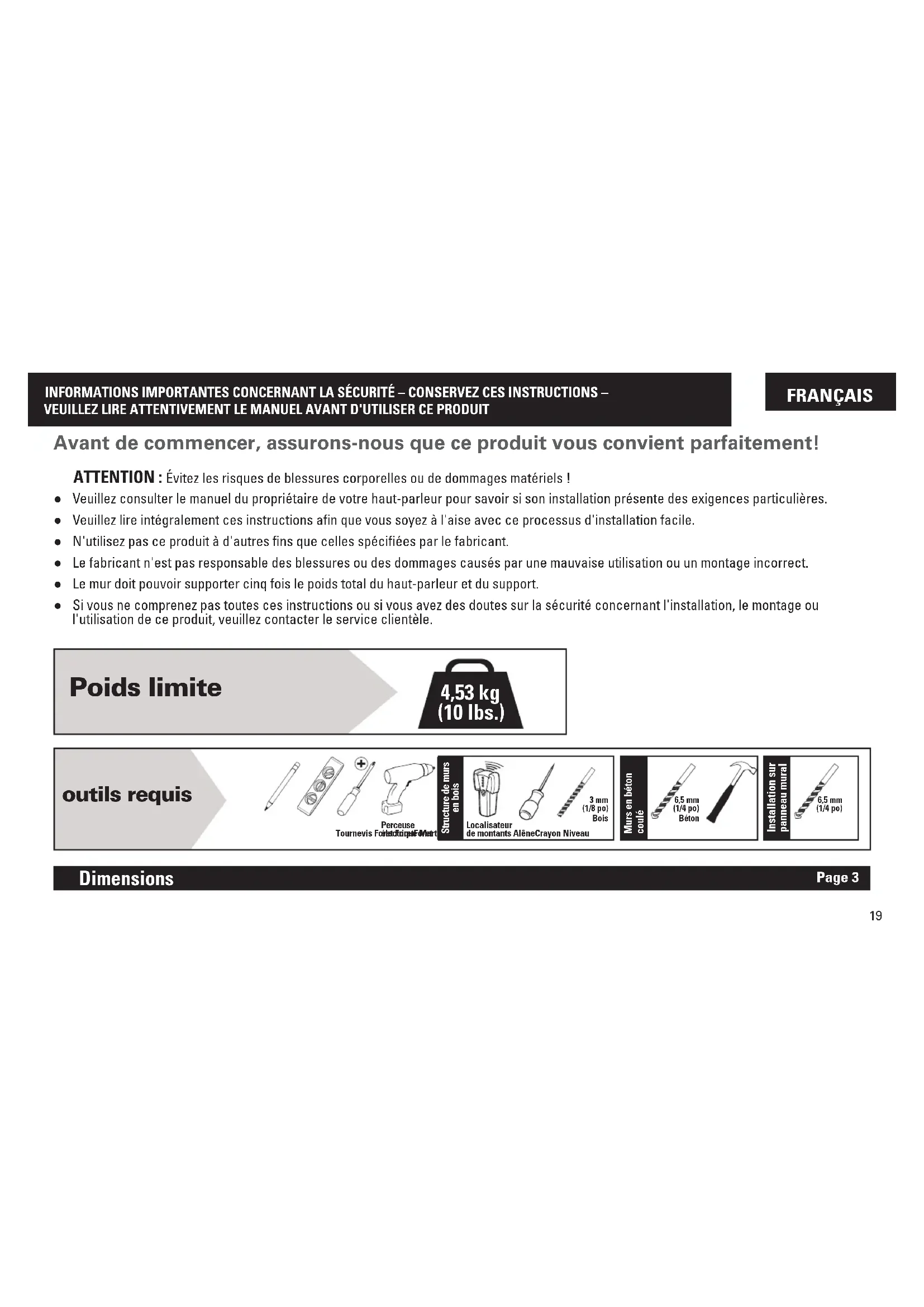 para completar el montaje. Montar el conjunto a la placa muralPASO 3 página 1319 FRANÇAIS INFORMATIONS IMPORTANTES CONCERNANT LA SÉCURITÉ – CONSERVEZ CES INSTRUCTIONS – VEUILLEZ LIRE ATTENTIVEMENT LE MANUEL AVANT D'UTILISER CE PRODUIT ● Veuillez consulter le manuel du propriétaire de votre haut-parleur pour savoir si son installation présente des exigences particulières. ● Veuillez lire intégralement ces instructions afin que vous soyez à l'aise avec ce processus d'installation facile. ● N'utilisez pas ce produit à d'autres fins que celles spécifiées par le fabricant. ● Le fabricant n'est pas responsable des blessures ou des dommages causés par une mauvaise utilisation ou un montage incorrect. ● Le mur doit pouvoir supporter cinq fois le poids total du haut-parleur et du support. ● Si vous ne comprenez pas toutes ces instructions ou si vous avez des doutes sur la sécurité concernant l'installation, le montage ou l'utilisation de ce produit, veuillez contacter le service clientèle. Avant de commencer, assurons-nous que ce produit vous convient parfaitement! ATTENTION: Évitez les risques de blessures corporelles ou de dommages matériels! 4,53 kg (10 lbs.) Poids limite outils requis 3 mm (1/8 po) Bois 6,5 mm (1/4 po)Béton6,5 mm (1/4 po)Tournevis Foret ForetForetPerceuseélectrique MarteauLocalisateur de montants AlêneCrayon Niveau Structure de murs en bois Murs en béton coulé Installation sur panneau mural Dimensions Page 320 AVERTISSEMENT : Ce produit contient de petites pièces qui peuvent représenter un risque d'étouffement si elles sont avalées. Avant de commencer l'assemblage, assurez-vous qu'il ne manque aucune pièce et qu'elles ne sont pas endommagées. Si une pièce est manquante ou endommagée, contactez le service à la clientèle et non le détaillant. N'utilisez jamais de pièces endommagées! REMARQUE: Les pièces fournies ne doivent pas nécessairement être toutes utilisées.. Les quantités illustrées correspondent à un seul support de haut-parleur. Pièces et quincaillerie fournies Page 4 ATTENTION: Évitez les risques de blessures corporelles ou de dommages matériels! ● L'épaisseur du revêtement de cloison sèche ne doit pas être inférieur à 12,7 mm (1/2po). ATTENTION: Évitez les risques de blessures corporelles ou de dommages matériels! Les deux vis