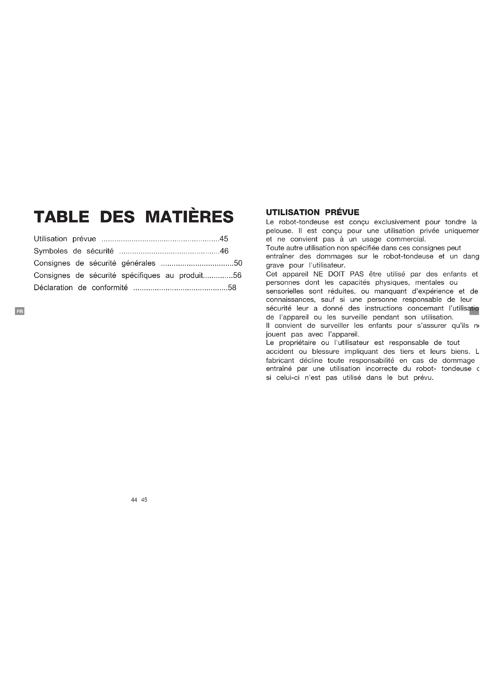 Le robot-tondeuse est conçu exclusivement pour tondre la pelouse. Il est conçu pour une utilisation privée uniquement et ne convient pas à un usage commercial. Toute autre utilisation non spécifiée dans ces consignes peut entraîner des dommages sur le robot-tondeuse et un danger grave pour l'utilisateur. Cet appareil NE DOIT PAS être utilisé par des enfants et des personnes dont les capacités physiques, mentales ou sensorielles sont réduites, ou manquant d’expérience et de connaissances, sauf si une personne responsable de leur sécurité leur a donné des instructions concernant l’utilisation de l’appareil ou les surveille pendant son utilisation. Il convient de surveiller les enfants pour s’assurer qu’ils ne jouent pas avec l’appareil. Le propriétaire ou l'utilisateur est responsable de tout accident ou blessure impliquant des tiers et leurs biens. Le fabricant décline toute responsabilité en cas de dommage entraîné par une utilisation incorrecte du robot- tondeuse ou si celui-ci n'est pas utilisé dans le but prévu.46 47 FR FR