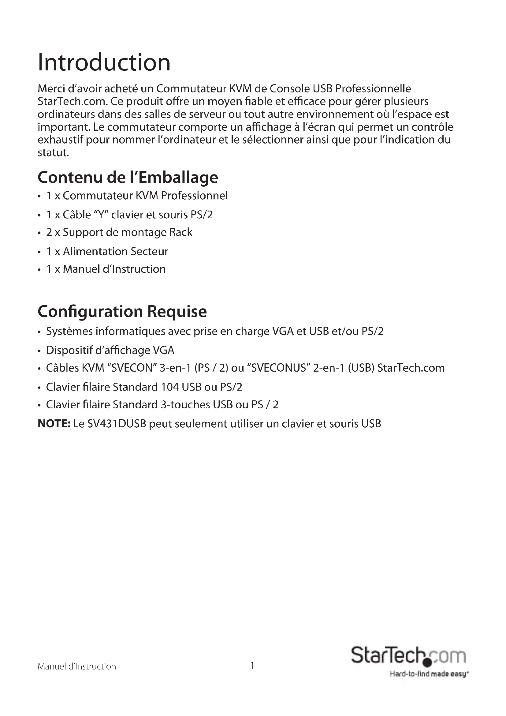 Introduction Merci d’avoir acheté un Commutateur KVM de Console USB Professionnelle StarTech.com. Ce produit ore un moyen able et ecace pour gérer plusieurs ordinateurs dans des salles de serveur ou tout autre environnement où l’espace est important. Le commutateur comporte un achage à l’écran qui permet un contrôle exhaustif pour nommer l’ordinateur et le sélectionner ainsi que pour l’indication du statut. Contenu de l’Emballage