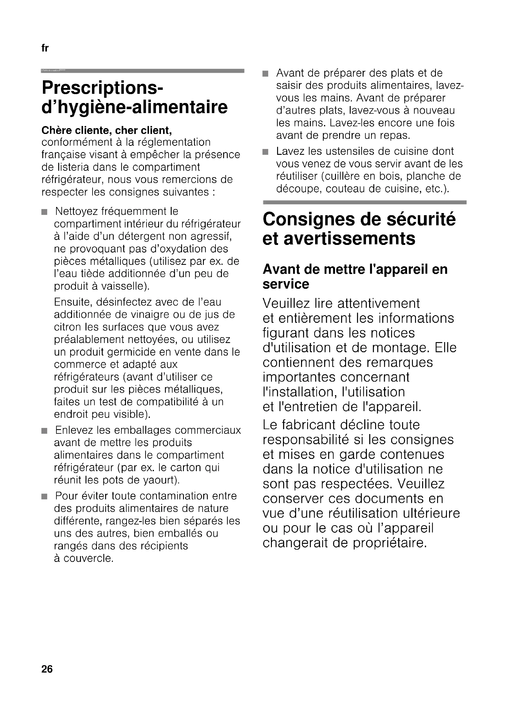 frTable des matièresfrNotice d’utilisationCombiné réfrigérateur-congélateur Prescriptions- d’hygiène-alimentaire Chère cliente, cher client, conformément à la réglementation française visant à empêcher la présence de listeria dans le compartiment réfrigérateur, nous vous remercions de respecter les consignes suivantes : ■ Nettoyez fréquemment le compartiment intérieur du réfrigérateur à l’aide d’un détergent non agressif, ne provoquant pas d’oxydation des pièces métalliques (utilisez par ex. de l’eau tiède additionnée d’un peu de produit à vaisselle). Ensuite, désinfectez avec de l’eau additionnée de vinaigre ou de jus de citron les surfaces que vous avez préalablement nettoyées, ou utilisez un produit germicide en vente dans le commerce et adapté aux réfrigérateurs (avant d’utiliser ce produit sur les pièces métalliques, faites un test de compatibilité à un endroit peu visible). ■ Enlevez les emballages commerciaux avant de mettre les produits alimentaires dans le compartiment réfrigérateur (par ex. le carton qui réunit les pots de yaourt). ■ Pour éviter toute contamination entre des produits alimentaires de nature différente, rangez-les bien séparés les uns des autres, bien emballés ou rangés dans des récipients à couvercle. ■ Avant de préparer des plats et de saisir des produits alimentaires, lavez- vous les mains. Avant de préparer d’autres plats, lavez-vous à nouveau les mains. Lavez-les encore une fois avant de prendre un repas. ■ Lavez les ustensiles de cuisine dont vous venez de vous servir avant de les réutiliser (cuillère en bois, planche de découpe, couteau de cuisine, etc.). Consignes de sécurité et avertissements Avant de mettre l'appareil en service Veuillez lire attentivement et entièrement les informations figurant dans les notices d'utilisation et de montage. Elle contiennent des remarques importantes concernant l'installation, l'utilisation et l'entretien de l'appareil. Le fabricant décline toute responsabilité si les consignes et mises en garde contenues dans la notice d'utilisation ne sont pas respectées. Veuillez conserver ces documents en vue d’une réutilisation ultérieure ou pour le cas où l’appareil changerait de propriétaire.fr