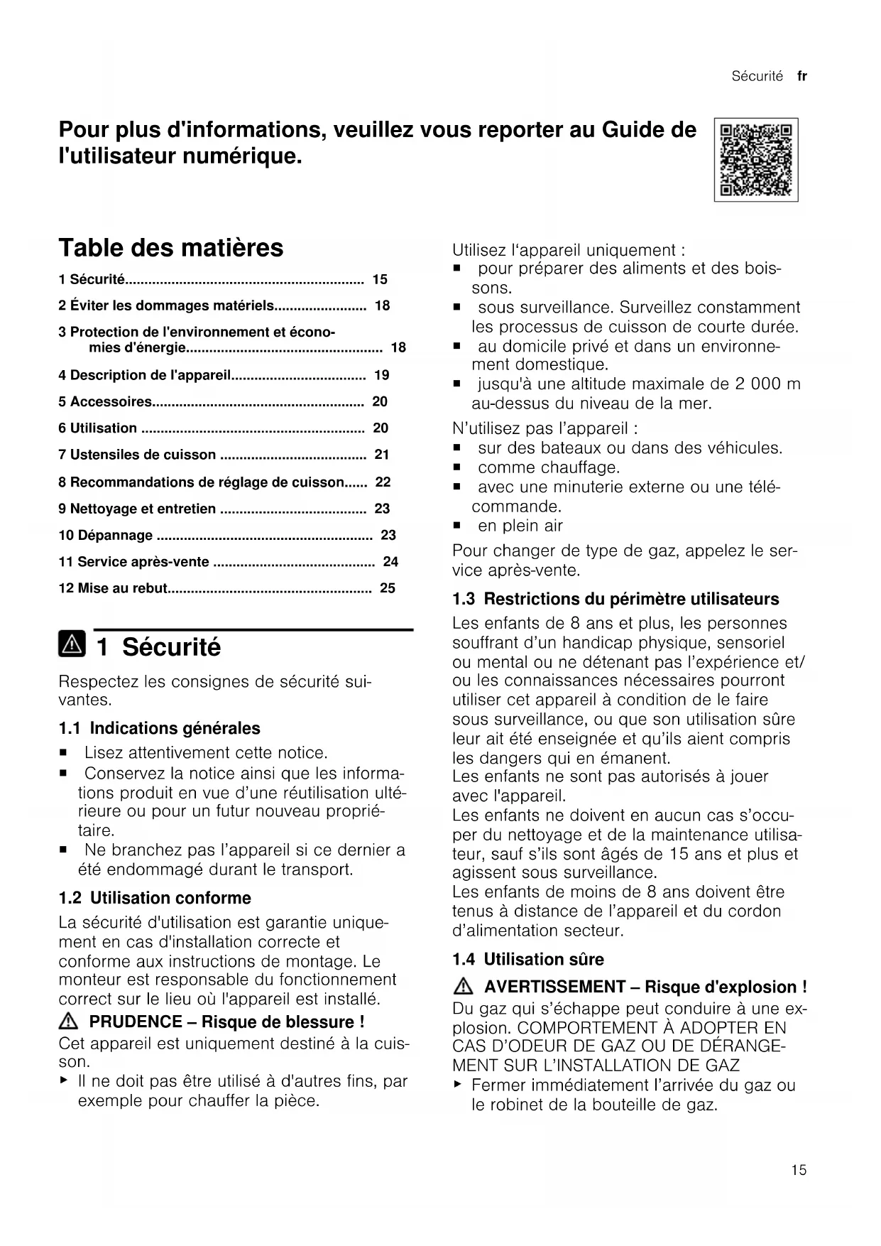 Il ne doit pas être utilisé à d'autres fins, par exemple pour chauffer la pièce. Utilisez l‘appareil uniquement: ¡ pour préparer des aliments et des bois- sons. ¡ sous surveillance. Surveillez constamment les processus de cuisson de courte durée. ¡ au domicile privé et dans un environne- ment domestique. ¡ jusqu'à une altitude maximale de 2000m au-dessus du niveau de la mer. N’utilisez pas l’appareil: ¡ sur des bateaux ou dans des véhicules. ¡ comme chauffage. ¡ avec une minuterie externe ou une télé- commande. ¡ en plein air Pour changer de type de gaz, appelez le ser- vice après-vente. 1.3 Restrictions du périmètre utilisateurs Les enfants de 8 ans et plus, les personnes souffrant d’un handicap physique, sensoriel ou mental ou ne détenant pas l’expérience et/ ou les connaissances nécessaires pourront utiliser cet appareil à condition de le faire sous surveillance, ou que son utilisation sûre leur ait été enseignée et qu’ils aient compris les dangers qui en émanent. Les enfants ne sont pas autorisés à jouer avec l'appareil. Les enfants ne doivent en aucun cas s’occu- per du nettoyage et de la maintenance utilisa- teur, sauf s’ils sont âgés de 15ans et plus et agissent sous surveillance. Les enfants de moins de 8ans doivent être tenus à distance de l’appareil et du cordon d’alimentation secteur. 1.4 Utilisation sûre AVERTISSEMENT‒Risque d'explosion! Du gaz qui s’échappe peut conduire à une ex- plosion. COMPORTEMENT À ADOPTER EN CAS D’ODEUR DE GAZ OU DE DÉRANGE-