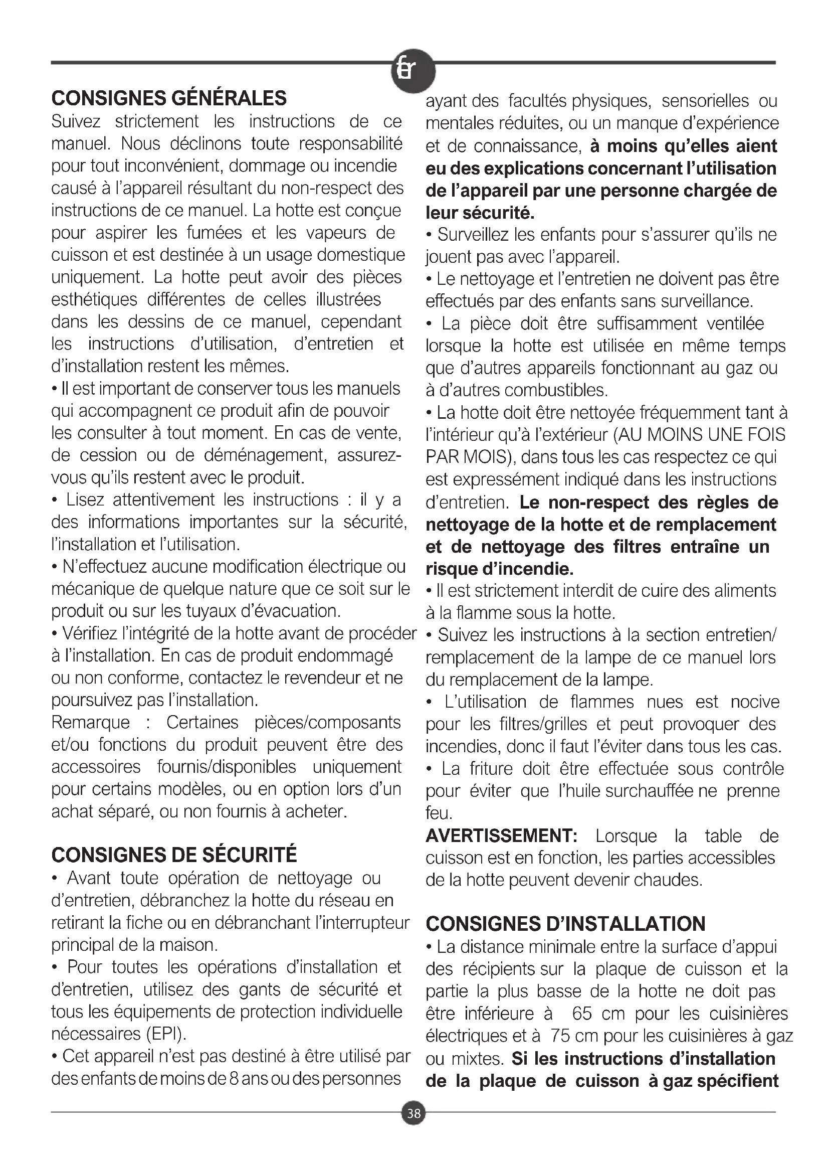 Suivez strictement les instructions de ce manuel. Nous déclinons toute responsabilité pour tout inconvénient, dommage ou incendie causé à l'appareil résultant du non-respect des instructions de ce manuel. La hotte est conçue pour aspirer les fumées et les vapeurs de cuisson et est destinée à un usage domestique uniquement. La hotte peut avoir des pièces esthétiques différentes de celles illustrées dans les dessins de ce manuel, cependant les instructions d'utilisation, d'entretien et d'installation restent les mêmes.