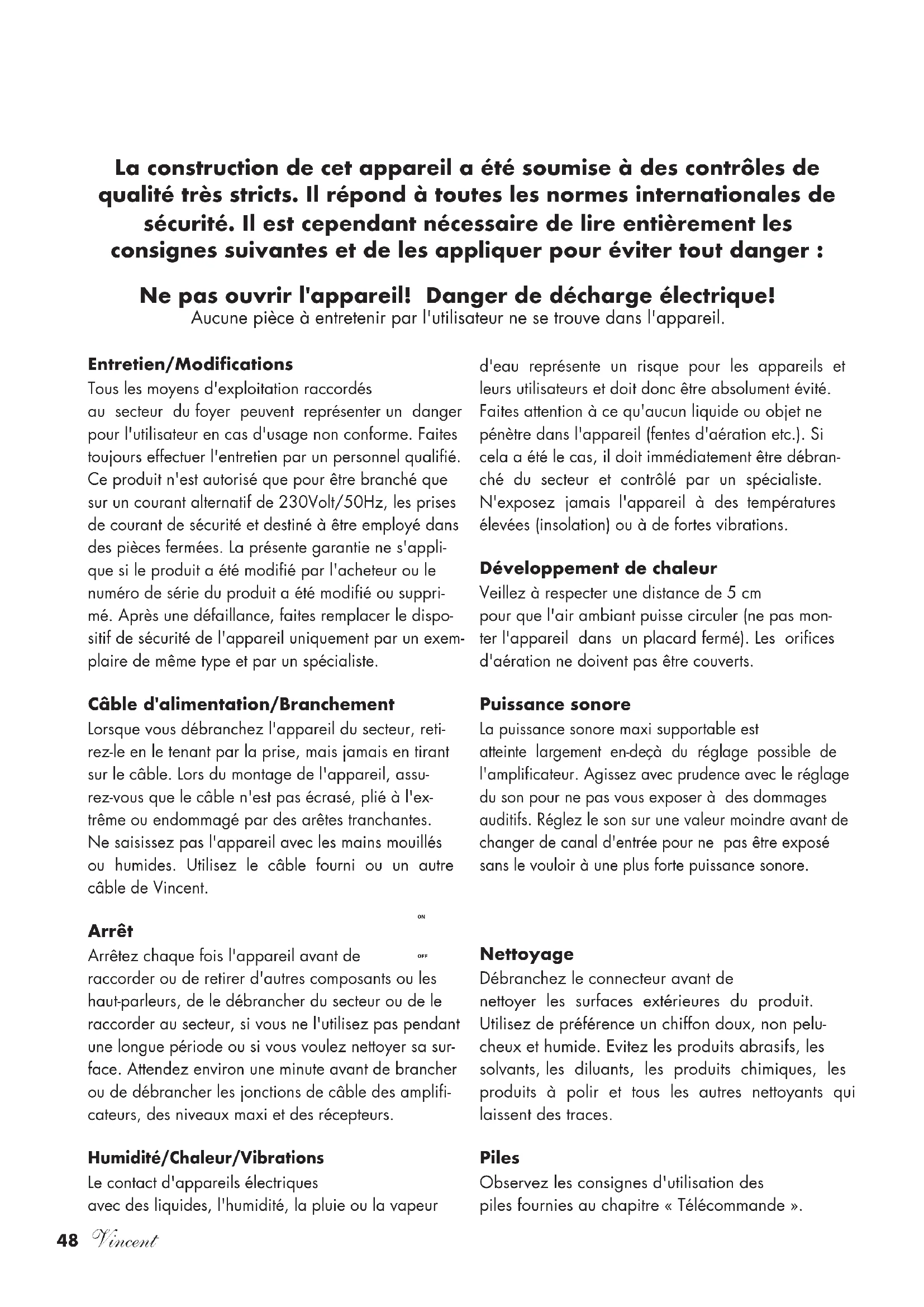 La construction de cet appareil a été soumise à des contrôles de qualité très stricts. Il répond à toutes les normes internationales de sécurité. Il est cependant nécessaire de lire entièrement les consignes suivantes et de les appliquer pour éviter tout danger : Nettoyage Débranchez le connecteur avant de nettoyer les surfaces extérieures du produit. Utilisez de préférence un chiffon doux, non pelu- cheux et humide. Evitez les produits abrasifs, les solvants, les diluants, les produits chimiques, les produits à polir et tous les autres nettoyants qui laissent des traces. Piles Observez les consignes d'utilisation des piles fournies au chapitre « Télécommande ». Entretien/Modifications Tous les moyens d'exploitation raccordés au secteur du foyer peuvent représenter un danger pour l'utilisateur en cas d'usage non conforme. Faites toujours effectuer l'entretien par un personnel qualifié. Ce produit n'est autorisé que pour être branché que sur un courant alternatif de 230Volt/50Hz, les prises de courant de sécurité et destiné à être employé dans des pièces fermées. La présente garantie ne s'appli- que si le produit a été modifié par l'acheteur ou le numéro de série du produit a été modifié ou suppri- mé. Après une défaillance, faites remplacer le dispo- sitif de sécurité de l'appareil uniquement par un exem- plaire de même type et par un spécialiste. Câble d'alimentation/Branchement Lorsque vous débranchez l'appareil du secteur, reti- rez-le en le tenant par la prise, mais jamais en tirant sur le câble. Lors du montage de l'appareil, assu- rez-vous que le câble n'est pas écrasé, plié à l'ex- trême ou endommagé par des arêtes tranchantes. Ne saisissez pas l'appareil avec les mains mouillés ou humides. Utilisez le câble fourni ou un autre câble de Vincent. Arrêt Arrêtez chaque fois l'appareil avant de raccorder ou de retirer d'autres composants ou les haut-parleurs, de le débrancher du secteur ou de le raccorder au secteur, si vous ne l'utilisez pas pendant une longue période ou si vous voulez nettoyer sa sur- face. Attendez environ une minute avant de brancher ou de débrancher les jonctions de câble des amplifi- cateurs, des niveaux maxi et des récepteurs. Humidité/Chaleur/Vibrations Le contact d'appareils électriques avec des liquides, l'humidité, la pluie ou la vapeur d'eau représente un risque pour les appareils et leurs utilisateurs et doit donc être absolument évité. Faites attention à ce qu'aucun liquide ou objet ne pénètre dans l'appareil (fentes d'aération etc.). Si cela a été le cas, il doit immédiatement être débran- ché du secteur et contrôlé par un spécialiste. N'exposez jamais l'appareil à des températures élevées (insolation) ou à de fortes vibrations. Développement de chaleur Veillez à respecter une distance de 5 cm pour que l'air ambiant puisse circuler (ne pas mon- ter l'appareil dans un placard fermé). Les orifices d'aération ne doivent pas être couverts. Puissance sonore La puissance sonore maxi supportable est atteinte largement en-deçà du réglage possible de l'amplificateur. Agissez avec prudence avec le réglage du son pour ne pas vous exposer à des dommages auditifs. Réglez le son sur une valeur moindre avant de changer de canal d'entrée pour ne pas être exposé sans le vouloir à une plus forte puissance sonore.