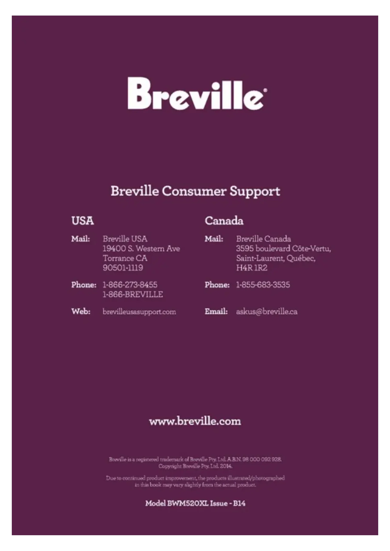 Consommateurs americains: www.brevilleusa.com Consommateurs canadiens: www.breville.ca