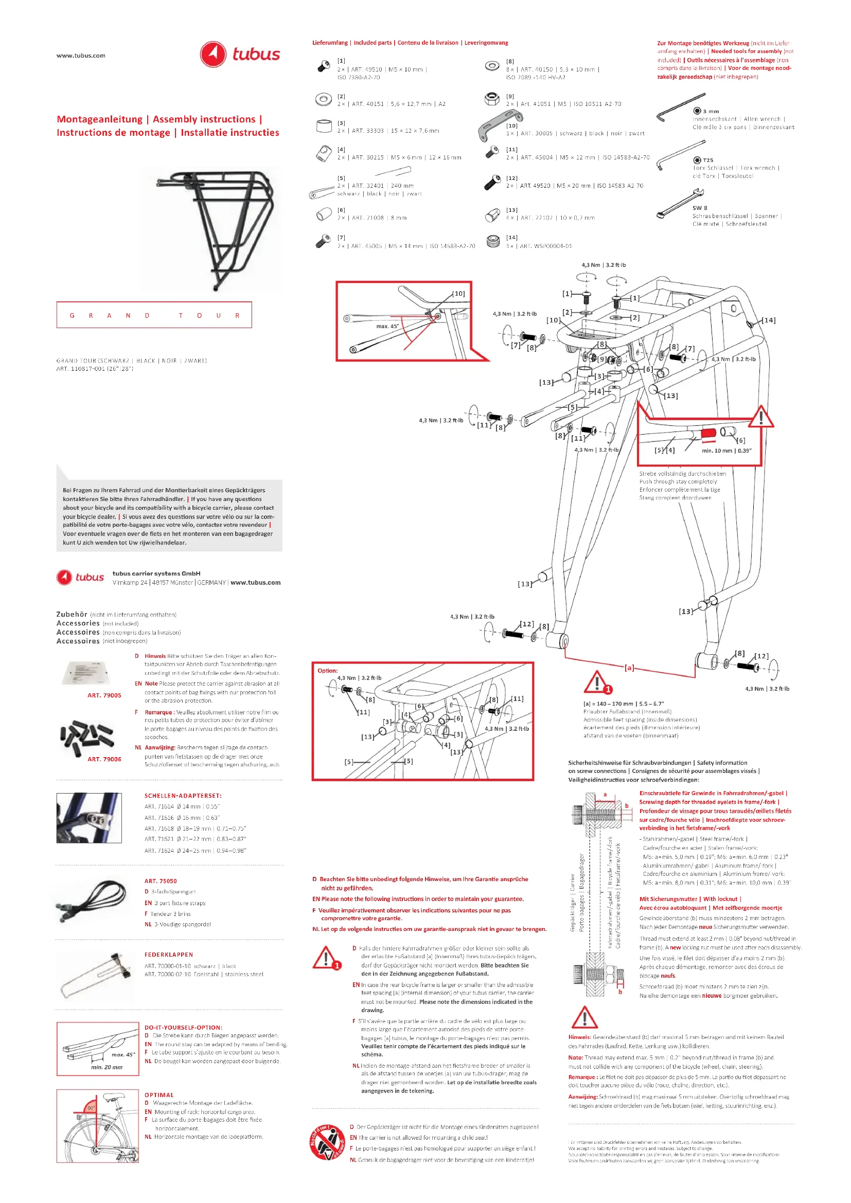 - Le porte-bagages GRAND TOUR est uniquement conçu et homologué pour être monté à l'arrière du vélo. Y'utilisez que des composants de montage spécifiques à cet article. Veuillez respecter les couples de serrage et la description (en matière de norme et de solidité) de chaque pièce de fixation liequants sur le schima de montage. Les couples sont indiqués en Newton a métro (Nm) et en pied-livre (foot-pound/ft.lb). Pour obtenir le couple de serrage adéquat, utilisez une clé dynamométrique.