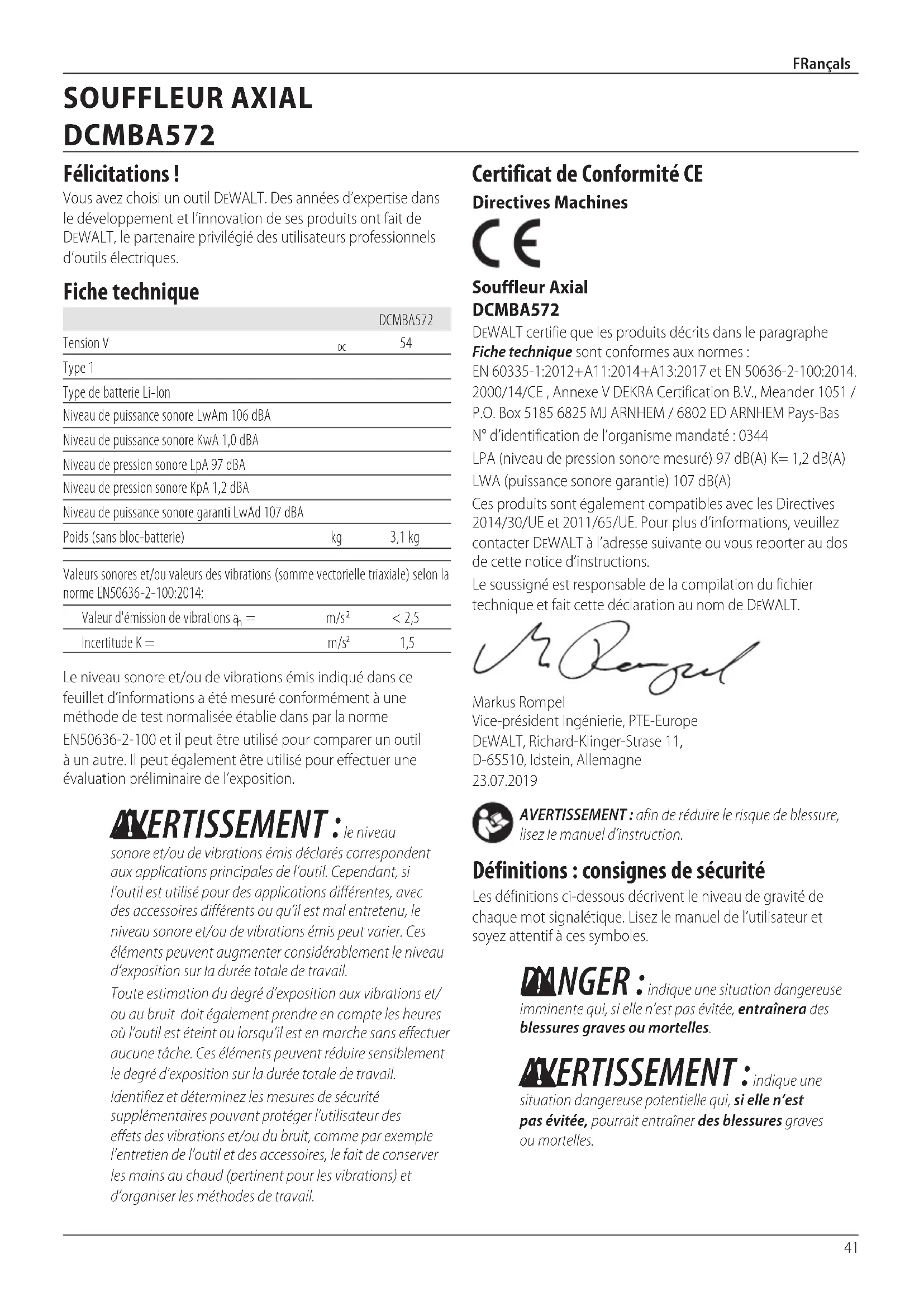 situation dangereuse potentielle qui, si elle n’est pas évitée, pourrait entraîner des blessures graves oumortelles. Certificat de Conformité CE Directives Machines Souffleur Axial DCMBA572 DeWALT certifie que les produits décrits dans le paragraphe Fiche technique sont conformes aux normes: EN 60335-1:2012+A11:2014+A13:2017 et EN 50636-2-100:2014. 2000/14/CE , Annexe V DEKRA Certification B.V., Meander 1051 / P.O. Box 5185 6825 MJ ARNHEM / 6802 ED ARNHEM Pays-Bas N° d’identification de l’organisme mandaté: 0344 LPA (niveau de pression sonore mesuré) 97 dB(A) K= 1,2 dB(A)LWA (puissance sonore garantie) 107 dB(A)Ces produits sont également compatibles avec les Directives 2014/30/UE et 2011/65/UE. Pour plus d’informations, veuillez contacter DeWALT à l’adresse suivante ou vous reporter au dos de cette notice d’instructions.Le soussigné est responsable de la compilation du fichier technique et fait cette déclaration au nom deDeWALT.Markus Rompel Vice-président Ingénierie, PTE-Europe DeWALT, Richard-Klinger-Strase 11, D-65510, Idstein, Allemagne 23.07.2019Le niveau sonore et/ou de vibrations émis indiqué dans ce feuillet d’informations a été mesuré conformément à une méthode de test normalisée établie dans par la norme EN50636-2-100 et il peut être utilisé pour comparer un outil à un autre. Il peut également être utilisé pour effectuer une évaluation préliminaire de l’exposition.