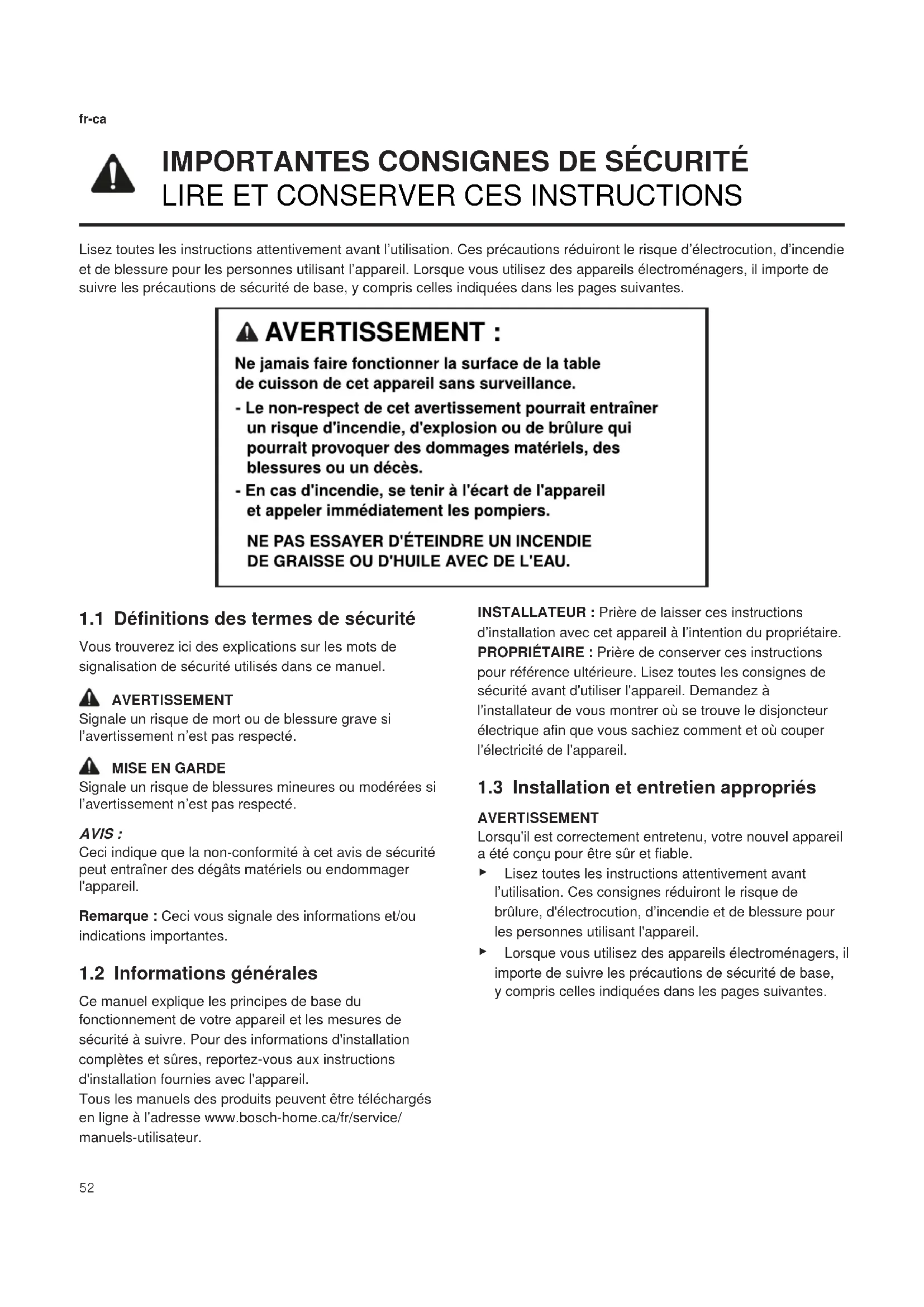Signale un risque de blessures mineures ou modérées si l’avertissement n’est pas respecté. AVIS : Ceci indique que la non-conformité à cet avis de sécurité peut entraîner des dégâts matériels ou endommager l'appareil. Remarque:Ceci vous signale des informations et/ou indications importantes. 1.2 Informations générales Ce manuel explique les principes de base du fonctionnement de votre appareil et les mesures de sécurité à suivre. Pour des informations d'installation complètes et sûres, reportez-vous aux instructions d'installation fournies avec l'appareil. Tous les manuels des produits peuvent être téléchargés en ligne à l'adresse www.bosch-home.ca/fr/service/ manuels-utilisateur. INSTALLATEUR: Prière de laisser ces instructions d’installation avec cet appareil à l’intention du propriétaire. PROPRIÉTAIRE: Prière de conserver ces instructions pour référence ultérieure. Lisez toutes les consignes de sécurité avant d'utiliser l'appareil. Demandez à l'installateur de vous montrer où se trouve le disjoncteur électrique afin que vous sachiez comment et où couper l'électricité de l'appareil. 1.3 Installation et entretien appropriés AVERTISSEMENT Lorsqu'il est correctement entretenu, votre nouvel appareil a été conçu pour être sûr et fiable. ▶ Lisez toutes les instructions attentivement avant l’utilisation. Ces consignes réduiront le risque de brûlure, d'électrocution, d’incendie et de blessure pour les personnes utilisant l'appareil. ▶ Lorsque vous utilisez des appareils électroménagers, il importe de suivre les précautions de sécurité de base, y compris celles indiquées dans les pages suivantes.