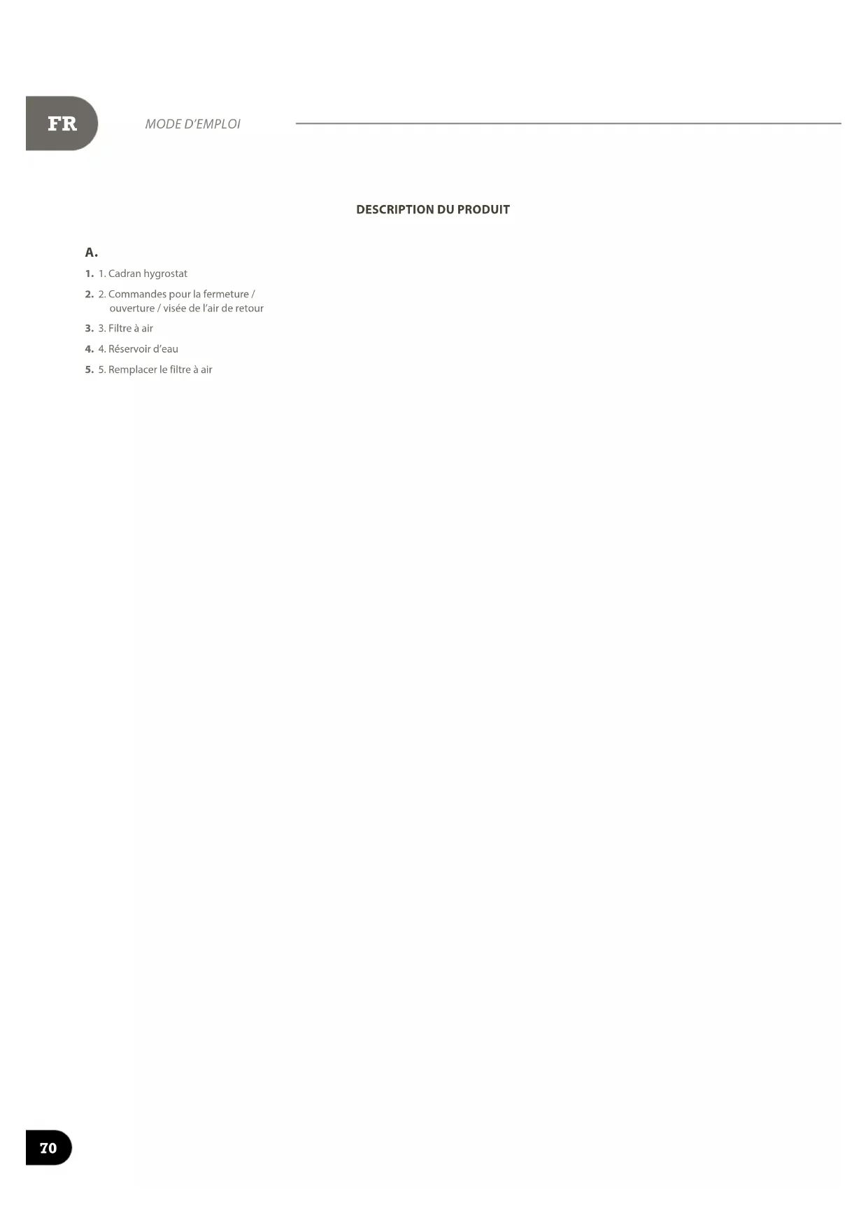 prise électrique. Le déshumidificateur redémarre dans le même mode que lors de sa déconnexion. FILTRE À AIR Le filtre à air situé à l’arrière du déshumidificateur évite que les bobines de réfrigération recueillent la poussière. Il est important que le filtre à air soit propre pour que l’air puisse circuler librement à l’intérieur du déshumidificateur. Le filtre doit donc être remplacé au besoin.73