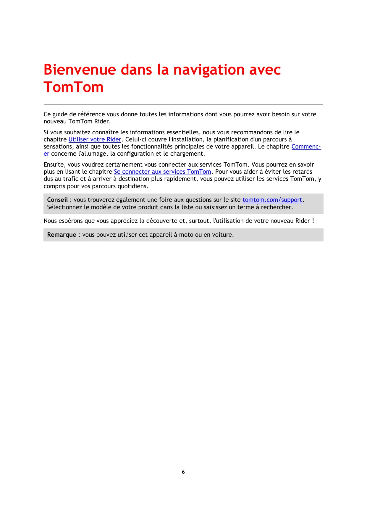 Bienvenue dans la navigation avec TomTom Ce guide de référence vous donne toutes les informations dont vous pourrez avoir besoin sur votre nouveau TomTom Rider. Si vous souhaitez connaître les informations essentielles, nous vous recommandons de lire le chapitre Utiliser votre Rider. Celui-ci couvre l'installation, la planification d'un parcours à sensations, ainsi que toutes les fonctionnalités principales de votre appareil. Le chapitre Commencer concerne l'allumage, la configuration et le chargement. Ensuite, vous voudrez certainement vous connecter aux services TomTom. Vous pourrez en savoir plus en lisant le chapitre Se connecter aux services TomTom. Pour vous aider à éviter les retards dus au trafic et à arriver à destination plus rapidement, vous pouvez utiliser les services TomTom, y compris pour vos parcours quotidiens. Conseil : vous trouverez également une foire aux questions sur le site tomtom.com/support. Sélectionnez le modèle de votre produit dans la liste ou saisissez un terme à rechercher. Nous espérons que vous appréciez la découverte et, surtout, l'utilisation de votre nouveau Rider ! Remarque : vous pouvez utiliser cet appareil à moto ou en voiture.