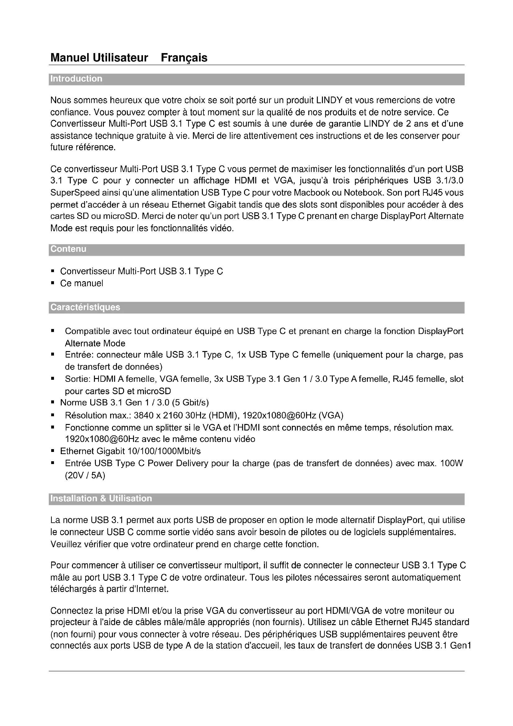 - Entrée USB Type C Power Delivery pour la charge (pas de transfert de données) avec max. 100W (20V / 5A) Installation & Utilisation La norme USB 3.1 permet aux ports USB de proposer en option le mode alternatif DisplayPort, qui utilise le connecteur USB C comme sortie vidéo sans avoir besoin de pilotes ou de logiciels supplémentaires. Veuillez vérifier que votre ordinateur prend en charge cette fonction. Pour commencer à utiliser ce convertisseur multiport, il suffit de connecter le connecteur USB 3.1 Type C mâle au port USB 3.1 Type C de votre ordinateur. Tous les pilotes nécessaires seront automatiquement téléchargés à partir d'Internet. Connectez la prise HDMI et/ou la prise VGA du convertisseur au port HDMI/VGA de votre moniteur ou projecteur à l'aide de câbles mâle/mâle appropriés (non fournis). Utilisez un câble Ethernet RJ45 standard (non fourni) pour vous connecter à votre réseau. Des périphériques USB supplémentaires peuvent être connectés aux ports USB de type A de la station d'accueil, les taux de transfert de données USB 3.1 Gen1Manuel Utilisateur Français 5Gbit/s sont pris en charge, les périphériques USB 2.0/1.1 peuvent également être connectés. Les emplacements pour cartes SD et microSD permettent l'accès aux cartes SD et micro SD. En connectant une alimentation USB de type C compatible (non fournie), il est également possible de charger votre Macbook ou ordinateur portable à l'aide du port d'alimentation de type C, il suffit de connecter l'alimentation au port Power Delivery si nécessaire.Manuale Italiano Introduzione Vi ringraziamo per aver acquistato acquistato il Converter USB 3.1 Tipo C Multi-Port. Questo prodotto è stato progettato per garantirvi la massima affidabilità e semplicità di utilizzo ed è coperto da 2 anni di garanzia LINDY oltre che da un servizio di supporto tecnico a vita. Per assicurarvi di farne un uso corretto vi invitiamo a leggere attentamente questo manuale e a conservarlo per future consultazioni. Questo Converter USB 3.1 Tipo C Multi-Port è stato progettato per massimizzare la funzionalità di una singola porta USB 3.1 Tipo C consentendo di collegare schermi HDMI e VGA, fino a tre periferiche USB 3.1/3.0 SuperSpeed e un alimentatore USB Tipo C ad un Macbook o notebook; in più mette a disposizione una porta RJ45 per una rete Gigabit Ethernet e slot per schede SD o microSD. Il computer con interfaccia USB 3.1 Tipo C a cui viene collegato deve avere il supporto della funzione DisplayPort Alternate Mode per poter trasmettere segnali video. Contenuto della confezione