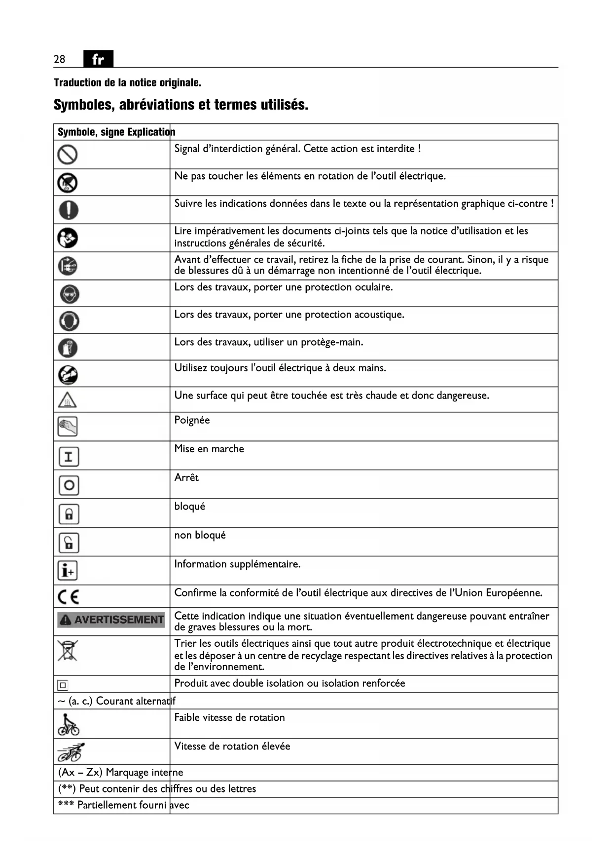 Traduction de la notice originale. Symboles, abréviations et termes utilisés. Symbole, signe Explication Signal d’interdiction général. Cette action est interdite ! Ne pas toucher les éléments en rotation de l’outil électrique. Suivre les indications données dans le texte ou la représentation graphique ci-contre ! Lire impérativement les documents ci-joints tels que la notice d’utilisation et les instructions générales de sécurité. Avant d’effectuer ce travail, retirez la fiche de la prise de courant. Sinon, il y a risque de blessures dû à un démarrage non intentionné de l’outil électrique. Lors des travaux, porter une protection oculaire. Lors des travaux, porter une protection acoustique. Lors des travaux, utiliser un protège-main. Utilisez toujours l'outil électrique à deux mains. Une surface qui peut être touchée est très chaude et donc dangereuse. Poignée Mise en marche Arrêt bloqué non bloqué Information supplémentaire. Confirme la conformité de l’outil électrique aux directives de l’Union Européenne. Cette indication indique une situation éventuellement dangereuse pouvant entraîner de graves blessures ou la mort. Trier les outils électriques ainsi que tout autre produit électrotechnique et électrique et les déposer à un centre de recyclage respectant les directives relatives à la protection de l’environnement. Produit avec double isolation ou isolation renforcée ~ (a. c.) Courant alternatif Faible vitesse de rotation Vitesse de rotation élevée (Ax – Zx) Marquage interne (**) Peut contenir des chiffres ou des lettres *** Partiellement fourni avec AVERTISSEMENT29