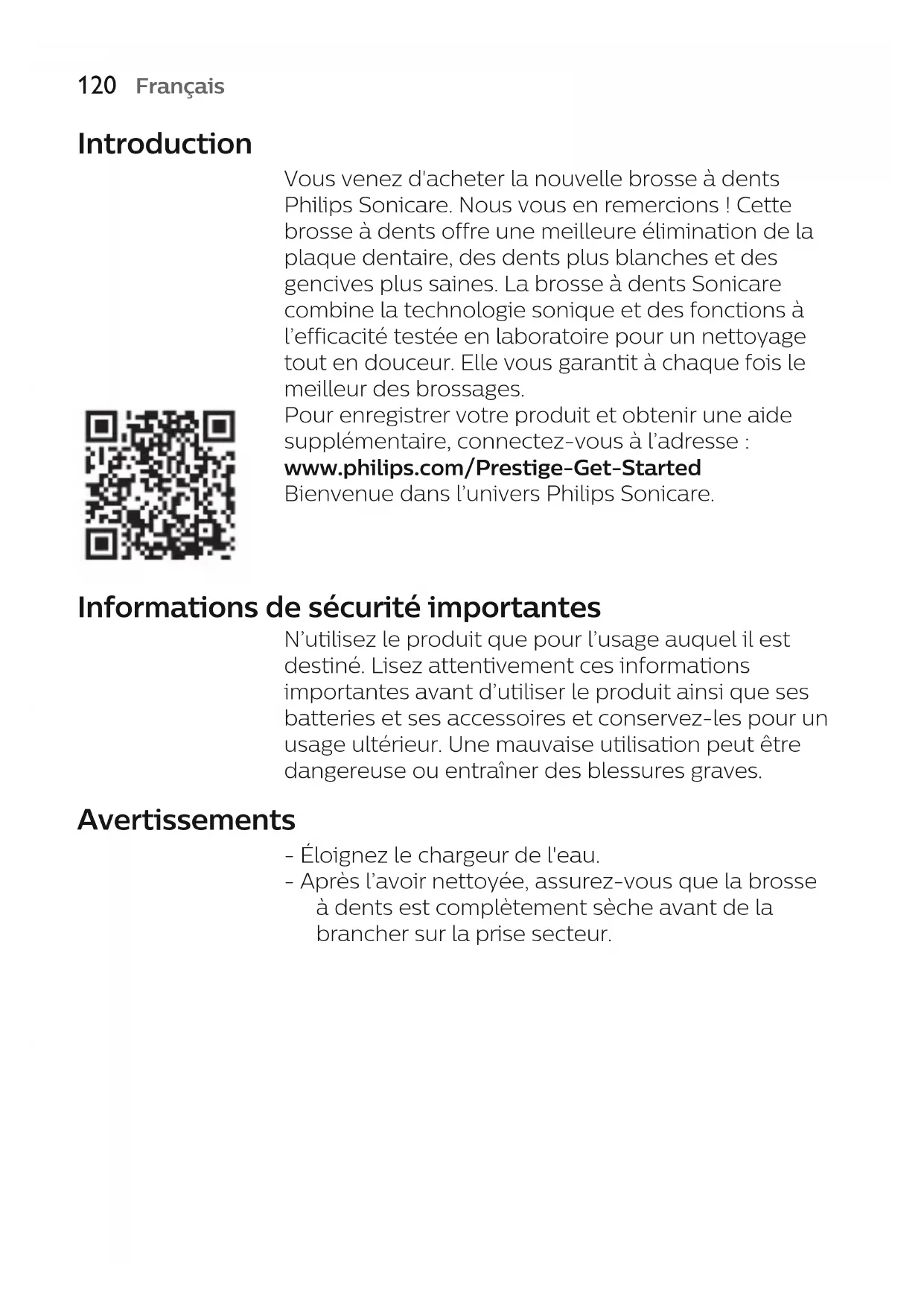 Français Introduction Vous venez d'acheter la nouvelle brosse à dents Philips Sonicare. Nous vous en remercions! Cette brosse à dents offre une meilleure élimination de la plaque dentaire, des dents plus blanches et des gencives plus saines. La brosse à dents Sonicare combine la technologie sonique et des fonctions à l’efficacité testée en laboratoire pour un nettoyage tout en douceur. Elle vous garantit à chaque fois le meilleur des brossages. Pour enregistrer votre produit et obtenir une aide supplémentaire, connectez-vous à l’adresse: www.philips.com/Prestige-Get-Started Bienvenue dans l’univers Philips Sonicare. Informations de sécurité importantes N’utilisez le produit que pour l’usage auquel il est destiné. Lisez attentivement ces informations importantes avant d’utiliser le produit ainsi que ses batteries et ses accessoires et conservez-les pour un usage ultérieur. Une mauvaise utilisation peut être dangereuse ou entraîner des blessures graves. Avertissements - Éloignez le chargeur de l'eau. - Après l’avoir nettoyée, assurez-vous que la brosse à dents est complètement sèche avant de la brancher sur la prise secteur.121 Français - Cet appareil peut être utilisé par des enfants, des personnes dont les capacités physiques, sensorielles ou intellectuelles sont réduites ou des personnes manquant d'expérience et de connaissances, à condition que ces enfants ou personnes soient sous surveillance ou qu'ils aient reçu des instructions quant à l'utilisation sécurisée de l'appareil et qu'ils aient pris connaissance des dangers encourus. Le nettoyage et l'entretien ne doivent pas être effectués par des enfants sans surveillance. - Les enfants ne doivent pas jouer avec l'appareil. - Utilisez exclusivement des accessoires ou des consommables Philipsd’origine. Utilisez uniquement le chargeur fourni avec le produit. Utilisez uniquement le câble USB et le bloc d’alimentation USB d’origine (s’ils sont fournis). - Cet appareil ne contient aucune pièce réparable par l’utilisateur. Si l’appareil est endommagé, cessez de l’utiliser et contactez le Service Consommateurs de votre pays (voir 'Garantie et assistance'). Si le câble est endommagé, remplacez le chargeur par un neuf. - N’utilisez pas le chargeur à l’extérieur ou près de surfaces chauffantes. - Ne nettoyez aucune pièce du produit au lave- vaisselle. - Cet appareil a été conçu uniquement pour le brossage des dents, des gencives et de la langue. - Cessez d’utiliser l’appareil et consultez votre dentiste/médecin en cas de saignement excessif après utilisation, si le saignement persiste après une semaine d’utilisation ou si vous ressentez une gêne ou une douleur. - Si vous avez reçu des soins bucco-dentaires, notamment au niveau des gencives, au cours des deux derniers mois, consultez votre dentiste avant d'utiliser cet appareil.122 Français - Si vous portez un stimulateur cardiaque ou tout autre dispositif implanté, consultez votre médecin ou le fabricant de votre dispositif avant d’utiliser cet appareil. - Si vous avez des problèmes de santé, consultez votre médecin avant d'utiliser cet appareil. - Cet appareil de soins est personnel et n’est pas destiné à être utilisé sur plusieurs patients dans les cabinets ou établissements dentaires. - Cessez d’utiliser une tête de brosse dont les brins sont écrasés ou tordus. Remplacez la tête de brosse tous les 3mois ou plus tôt si vous constatez des signes d’usure. - Si votre dentifrice contient du peroxyde, du bicarbonate de soude ou du bicarbonate (couramment utilisés dans les dentifrices blanchissants), veillez à bien nettoyer la tête de brosse avec de l’eau savonneuse après chaque utilisation. Cela permet de prévenir toute fissure éventuelle du plastique. - Evitez tout contact direct avec des produits qui contiennent des huiles essentielles ou de l'huile de coprah. Ce contact peut déloger les brins de la brosse à dents. - Pour charger la batterie, utilisez uniquement l’adaptateur mural USB, le socle de charge et le coffret de voyage fournis avec le produit: WAA1001, WAA2001, HX9200 ou HX9200/B et TCC1001, TCC2001, TCC3001, CBB1001 ou CBB2001. N’utilisez pas de rallonge. - Utilisez, chargez et conservez le produit à une température comprise entre 0°C et 40°C. - Tenez le produit et les piles à l’abri du feu et ne les exposez pas directement aux rayons du soleil ou à des températures élevées. - Si le produit devient anormalement chaud, dégage une odeur, change de couleur ou si la charge prend plus de temps que d’habitude, cessez d’utiliser et de charger le produit et contactez Philips.123 Français - Ne placez pas les produits et leurs piles dans un four à micro-ondes ou sur une table de cuisson à induction. - Afin d’éviter que les piles ne surchauffent ou ne dégagent des substances toxiques ou dangereuses, le produit et les piles ne doivent pas être ouverts, modifiés, percés, endommagés ou démontés. Les piles ne doivent pas être court- circuitées ou surchargées et leur polarité ne doit pas être inversée. - Si les piles sont endommagées ou fuient, évitez tout contact avec les yeux ou la peau. Si cela se produit, laver immédiatement et abondamment avec de l'eau et consulter un médecin. Champs électromagnétiques (CEM) Cet appareil Philips est conforme à toutes les normes et à tous les règlements applicables relatifs à l'exposition aux champs électromagnétiques. Directive sur l'équipement radio Par la présente, Philips déclare que les brosses à dents électriques équipées d’une interface radiofréquence (Bluetooth ou BrushSync) sont conformes à la directive2014/53/UE. - Radiofréquence Bluetooth: 2,4GHz - Puissance de radiofréquence Bluetooth maximale: 3dBm - RadiofréquenceNFC: 13,56MHz - Puissance de radiofréquence NFC maximale: 30,16dBm Le texte intégral de la déclaration de conformité aux directives de l’Union europ