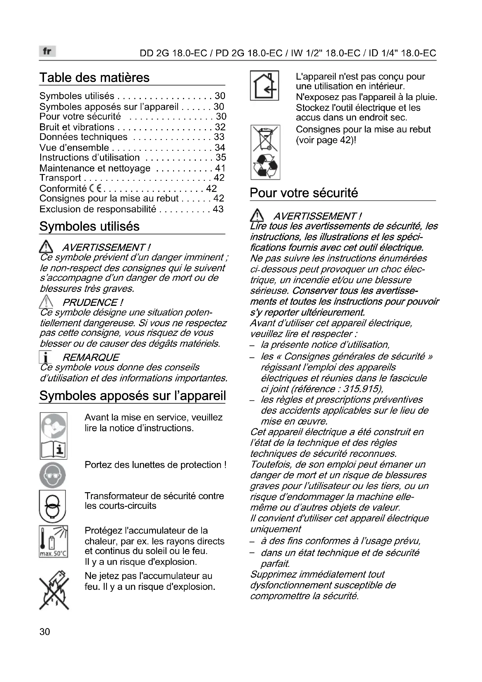 Récupérer les matières premières plutôt que de les jeter à la poubelle. Il est recommandé d'introduire l’appareil, ses accessoires et l’emballage dans un circuit de recyclage adapté à l’environnement. Les pièces en plastique comportent un marquage pour permettre leur tri avant recyclage. AVERTISSEMENT ! Ne jetez pas les accus / batteries dans la poubelle des déchets domestiques ; ne les jetez ni au feu ni dans l’eau. Ne tentez pas d’ouvrir des accus qui ne servent plus. Les accus/batteries doivent être collectés, recyclés ou éliminés dans le respect de l'environnement. Pays de l’UE uniquement. Conformément à la directive européenne 2006/66/CE les accus / batteries défectueux ou épuisés devront être collectés séparément et introduits dans un circuit de recyclage respectueux de l’environnement. REMARQUE Pour connaître les possibilités de mise au rebut, veuillez consulter votre revendeur spécialisé. Exclusion de responsabilité Le fabricant et son représentant ne pourront être tenus responsables des dommages et du bénéfice perdu en raison d’une inter- ruption du fonctionnement de l’affaire, provoqués par le produit ou par l’impossibilité de l’utiliser. Le fabricant et son représentant ne pourront être tenus responsables des dommages pro- voqués par une utilisation inexperte du produit ou par son utilisation en association avec les produits d’autres fabricants.DD 2G 18.0-EC / PD 2G 18.0-EC / IW 1/2" 18.0-EC / ID 1/4" 18.0-EC