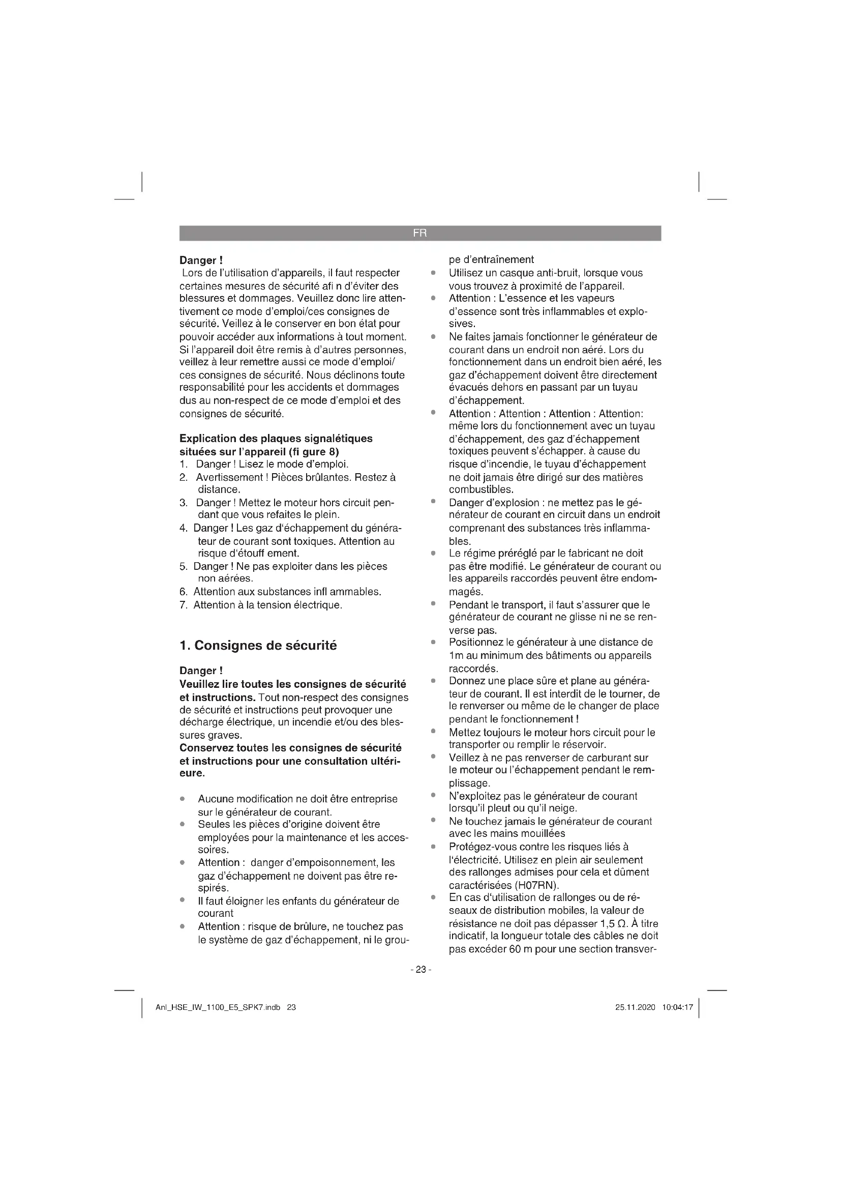 les câbles d’alimentation électriques et les appareils raccordés doivent être dans un état Anl_HSE_IW_1100_E5_SPK7.indb 24Anl_HSE_IW_1100_E5_SPK7.indb 24 25.11.2020 10:04:1725.11.2020 10:04:17FR