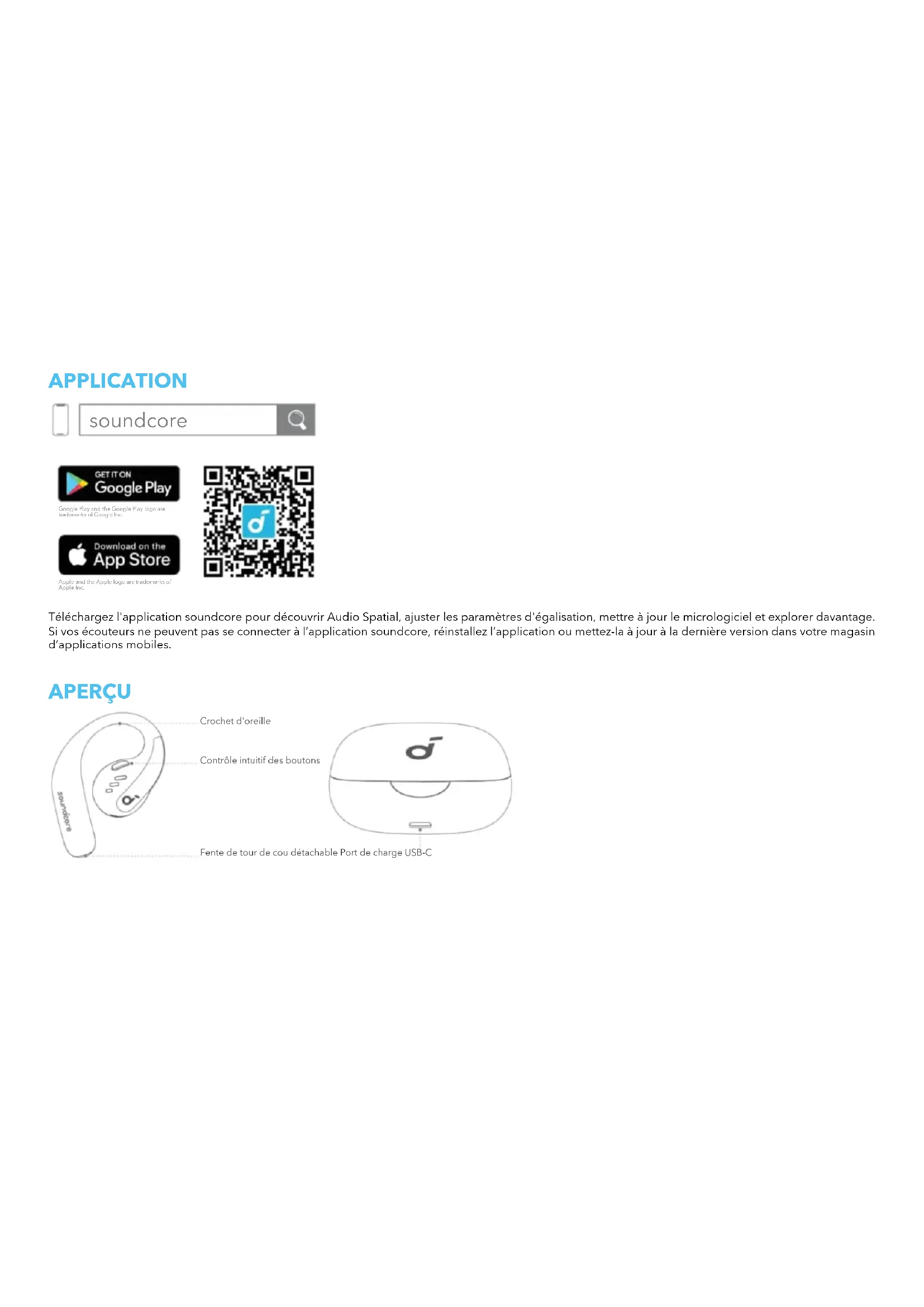 RÉINITIALISATION SpécificationsAPPLICATION soundcore Apple and the Apple logo are trademarks of Apple Inc. Google Play and the Google Play logo are trademarks of Google Inc. Téléchargez l'application soundcore pour découvrir Audio Spatial, ajuster les paramètres d'égalisation, mettre à jour le micrologiciel et explorer davantage. Si vos écouteurs ne peuvent pas se connecter à l’application soundcore, réinstallez l’application ou mettez-la à jour à la dernière version dans votre magasin d’applications mobiles. APERÇU Contrôle intuitif des boutons Crochet d'oreille Fente de tour de cou détachable Port de charge USB-CUTILISATION Sans tour de cou amovible (usage quotidien):