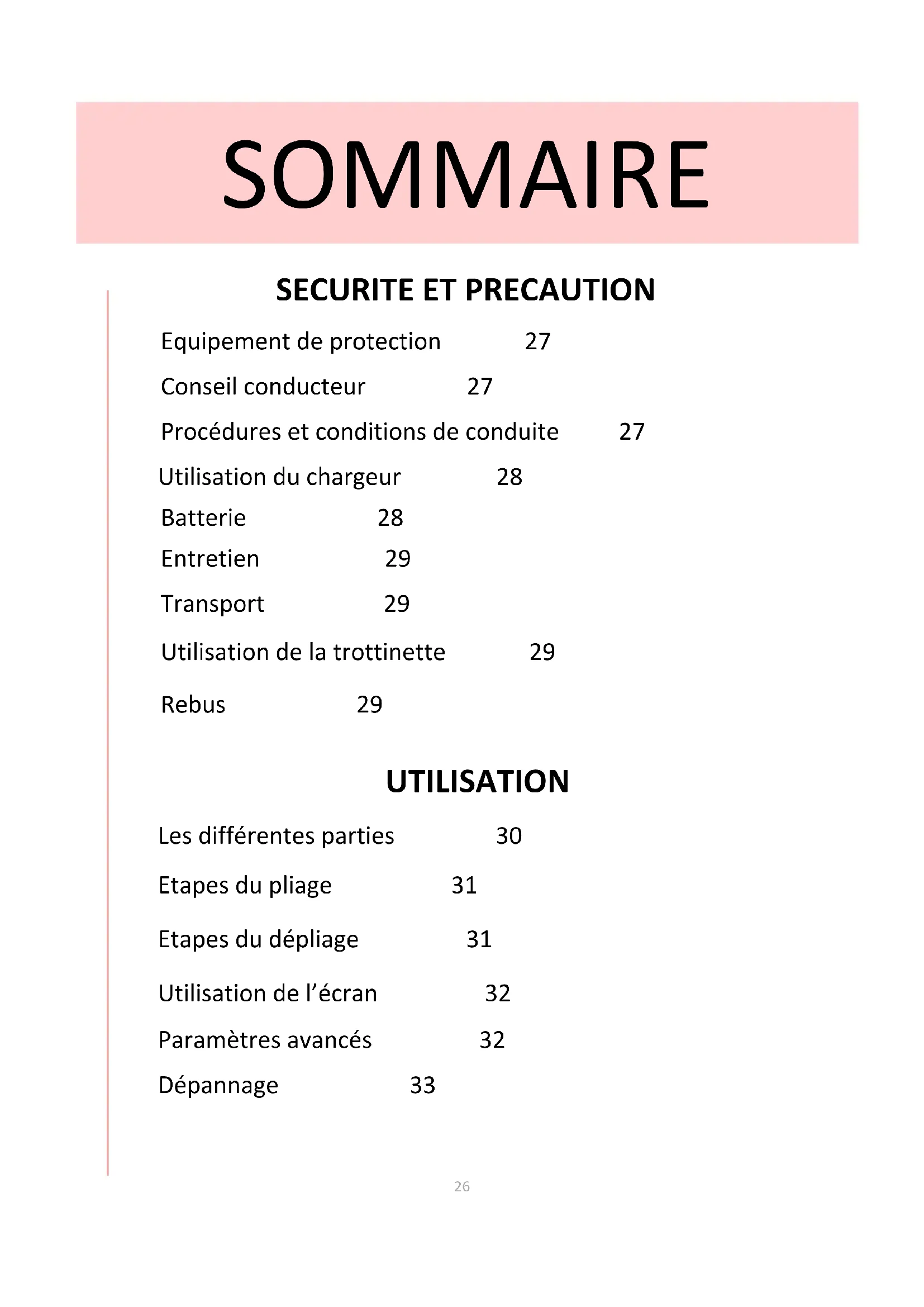 Equipement de protection 27 Conseil conducteur 27 Procédures et conditions de conduite 27 Utilisation du chargeur 28 Batterie 28 Entretien 29 Transport 29 Utilisation de la trottinette 29 Rebus 29 UTILISATION Les différentes parties 30 Etapes du pliage 31 Etapes du dépliage 31 Utilisation de l’écran 32 Paramètres avancés 32 Dépannage 33 SOMMAIRE27