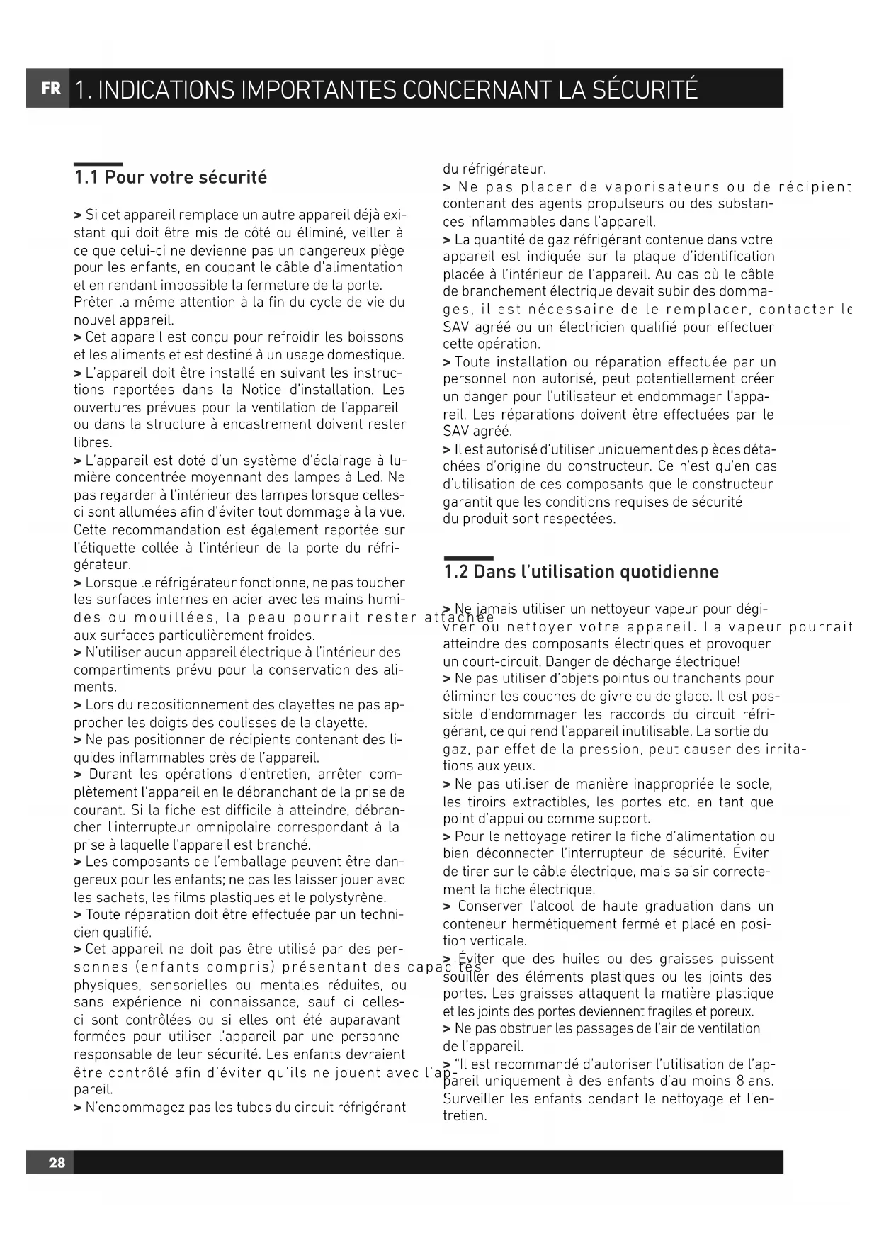> Si cet appareil remplace un autre appareil déjà exi- stant qui doit être mis de côté ou éliminé, veiller à ce que celui-ci ne devienne pas un dangereux piège pour les enfants, en coupant le câble d’alimentation et en rendant impossible la fermeture de la porte. Prêter la même attention à la fin du cycle de vie du nouvel appareil. > Cet appareil est conçu pour refroidir les boissons et les aliments et est destiné à un usage domestique. > L’appareil doit être installé en suivant les instruc- tions reportées dans la Notice d’installation. Les ouvertures prévues pour la ventilation de l’appareil ou dans la structure à encastrement doivent rester libres. > L’appareil est doté d’un système d’éclairage à lu- mière concentrée moyennant des lampes à Led. Ne pas regarder à l’intérieur des lampes lorsque celles- ci sont allumées afin d’éviter tout dommage à la vue. Cette recommandation est également reportée sur l’étiquette collée à l’intérieur de la porte du réfri- gérateur. > Lorsque le réfrigérateur fonctionne, ne pas toucher les surfaces internes en acier avec les mains humi- des ou mouillées, la peau pourrait rester attachée aux surfaces particulièrement froides. > N’utiliser aucun appareil électrique à l’intérieur des compartiments prévu pour la conservation des ali- ments. > Lors du repositionnement des clayettes ne pas ap- procher les doigts des coulisses de la clayette. > Ne pas positionner de récipients contenant des li- quides inflammables près de l’appareil. > Durant les opérations d’entretien, arrêter com- plètement l’appareil en le débranchant de la prise de courant. Si la fiche est dicile à atteindre, débran- cher l’interrupteur omnipolaire correspondant à la prise à laquelle l’appareil est branché. > Les composants de l’emballage peuvent être dan- gereux pour les enfants; ne pas les laisser jouer avec les sachets, les films plastiques et le polystyrène. > Toute réparation doit être eectuée par un techni- cien qualifié. > Cet appareil ne doit pas être utilisé par des per- sonnes (enfants compris) présentant des capacités physiques, sensorielles ou mentales réduites, ou sans expérience ni connaissance, sauf ci celles- ci sont contrôlées ou si elles ont été auparavant formées pour utiliser l’appareil par une personne responsable de leur sécurité. Les enfants devraient être contrôlé afin d’éviter qu’ils ne jouent avec l’ap- pareil. > N’endommagez pas les tubes du circuit réfrigérant du réfrigérateur. > Ne pas placer de vaporisateurs ou de récipients contenant des agents propulseurs ou des substan- ces inflammables dans l’appareil. > La quantité de gaz réfrigérant contenue dans votre appareil est indiquée sur la plaque d’identification placée à l’intérieur de l’appareil. Au cas où le câble de branchement électrique devait subir des domma- ges, il est nécessaire de le remplacer, contacter le SAV agréé ou un électricien qualifié pour eectuer cette opération. > Toute installation ou réparation eectuée par un personnel non autorisé, peut potentiellement créer un danger pour l’utilisateur et endommager l’appa- reil. Les réparations doivent être eectuées par le SAV agréé. > Il est autorisé d’utiliser uniquement des pièces déta- chées d’origine du constructeur. Ce n’est qu’en cas d’utilisation de ces composants que le constructeur garantit que les conditions requises de sécurité du produit sont respectées.