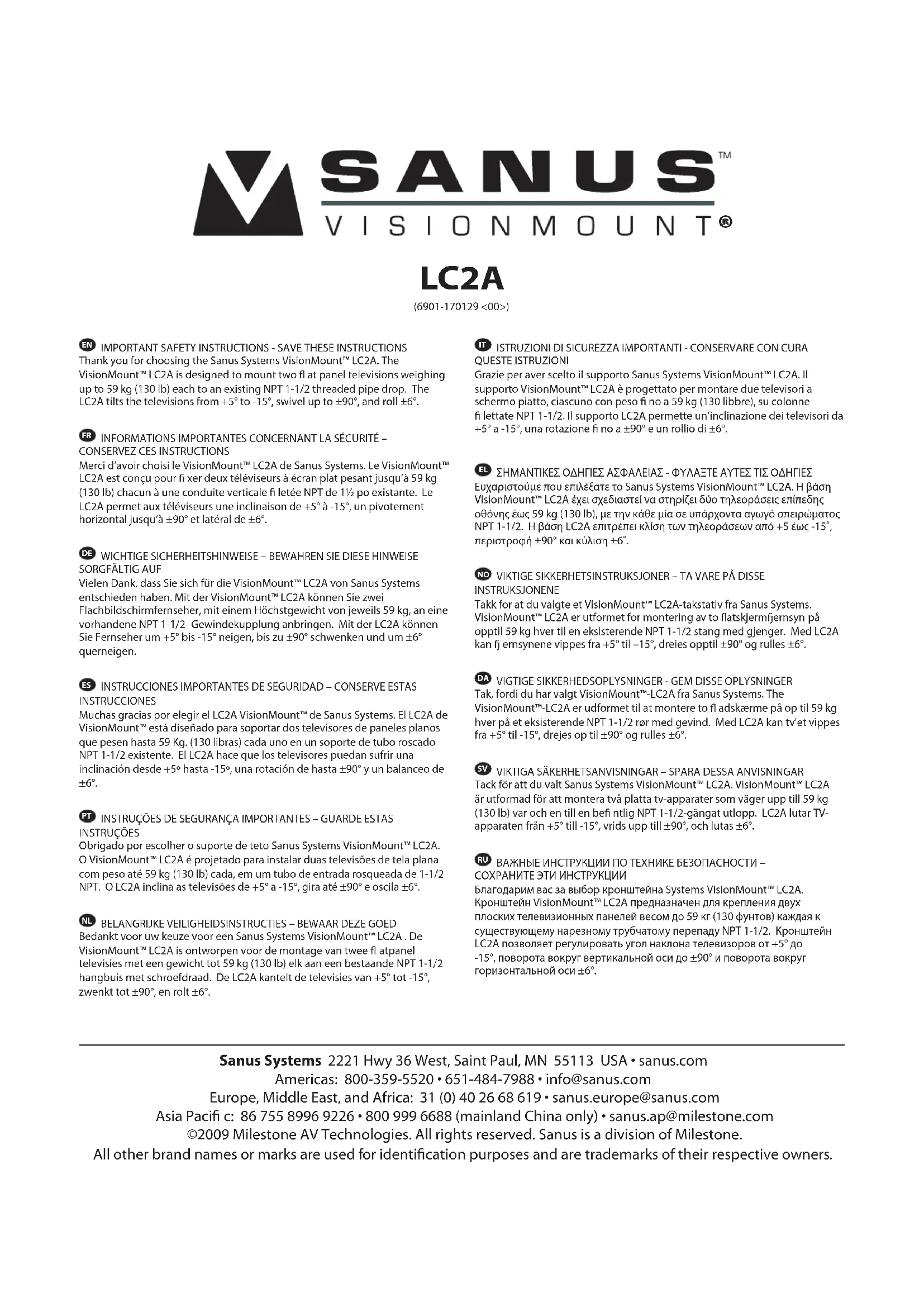 Merci d’avoir choisi le VisionMount™ LC2A de Sanus Systems. Le VisionMount™ LC2A est conçu pour xer deux téléviseurs à écran plat pesant jusqu’à 59 kg (130 lb) chacun à une conduite verticale letée NPT de 1½ po existante. Le LC2A permet aux téléviseurs une inclinaison de +5° à -15°, un pivotement horizontal jusqu’à ±90° et latéral de ±6°.