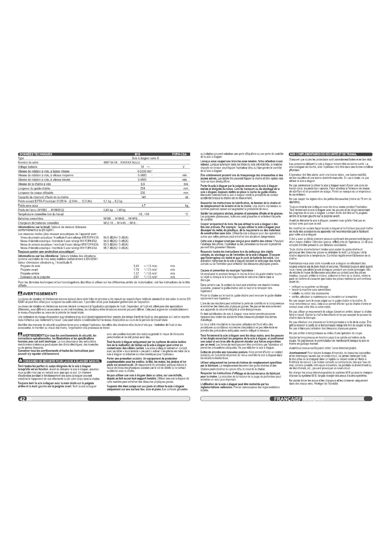 - vérifi er, eff ectuer la maintenance ou travailler sur la machine Ne pas couper avec le corps aligné sur le guide-chaîne et la chaîne. Si vous rencontrez un recul, cela vous permet d'éviter que la chaîne n'entre en contact avec votre tête ou votre corps. Ne pas utiliser un mouvement de sciage d'avant en arrière, laisser la chaîne faire le travail. Garder la chaîne tranchante et ne pas essayer de pousser la chaîne dans la découpe. Ne pas eff ectuer une pression sur la tronçonneuse à la fi n de la coupe. Être prêt à recevoir le poids de la tronçonneuse lorsqu'elle fi nit de couper le bois. Ne pas le faire peut entraîner des blessures physiques graves. Ne pas arrêter la tronçonneuse au milieu d'une opération de coupe. Garder la tronçonneuse en fonction jusqu'à ce qu'elle soit retirée de la coupe. Ne pas bloquer le commutateur de marche/arrêt lorsque la scie se trouve en guidage manuel. Avant tous travaux sur l'appareil retirer l’accu interchangeable. Avertissement! Pour réduire le risque d‘incendie, de blessures corporelles et de dommages causés par un court-circuit, ne jamais immerger l‘outil, le bloc-piles ou le chargeur dans un liquide ou laisser couler un fl uide à l‘intérieur de celui-ci. Les fl uides corrosifs ou conducteurs, tels que l‘eau de mer, certains produits chim-iques industriels, les produits de blanchiment ou de blanchiment, etc., peuvent provoquer un court-circuit. Ne charger les accus interchangeables du système M18 qu’avec le chargeur d’accus du système M18. Ne pas charger des accus d’autres systèmes. Ne jamais forcer les accus et les chargeurs et les conserver uniquement dans des locaux secs. Protéger de l'humidité. Scie à élaguer sans fi l44 45FRANÇAISFRANÇAIS Pousser et tirer La force de réaction est toujours opposée à la direction de déplacement de la chaîne. Ainsi, l'opérateur doit être prêt à contrôler la tendance à avancer de la machine (mouvement avant) lors de la coupe sur le coin inférieur de la barre et à être repoussé (mouvement vers l'opérateur) lorsqu'il coupe le long du coin supérieur. Réaction Réaction Sens de rotation Sens de rotation Tronçonneuse bloquée dans la coupe Arrêter le scie à élaguer et la rendre sûre. Ne pas essayer de forcer sur la chaîne et la barre pour les sortir de la coupe car cela peut casser la chaîne qui peut alors revenir en arrière et frapper l'opérateur. La situation se produit normalement parce que le bois n'est pas soutenu correctement ce qui fait se fermer la coupe par compression et pince ainsi la lame. Si l'ajustement du support ne libère pas la barre et la chaîne, utiliser des gabarits en bois ou un levier pour ouvrir la coupe et libérer la lame. Ne pas essayer de démarrer la scie à élaguer lorsque le guide-chaîne est déjà dans une coupe ou une entaille. Patinage / rebond Lorsque la scie à élaguer n'arrive pas à creuser pendant une couper, le guide-chaîne peut commencer à sautiller ou à patiner dangereusement le long de la surface de la bûche ou d'une branche et entraîner éventuellement la perte de contrôle de la scie à élaguer. Afi n d'éviter ou de réduire le patinage, toujours utiliser la scie à élaguer des deux mains et s'assurer que la chaîne établit une rainure pour la découpe. Ne jamais découper les petite branches ou broussailles fl exibles avec votre scie à élaguer. Leur taille et leur souplesse peut entraîner le recul de la scie à élaguer vers vous ou causer une force suffi sante pour entraîner un recul. Le meilleur outil pour ce type de travail est une scie manuelle, un sécateur, une hache ou d'autres outils manuels. Équipement de protection individuelle (Voir page 16) Porter un casque en permanence pendant l'utilisation de la machine. Un casque équipé d'une visière en maille peut réduire le risque de blessure au visage et à la tête en cas de recul. Portez une protection acoustique. L'exposition au bruit pourrait provoquer une diminution de l'ouïe. Un équipement de protection individuelle de bonne qualité, tel celui utilisé par les professionnels, réduit le risque de blessure de l'opérateur. Les éléments suivants doivent être utilisés lors de l'utilisation de la machine : Casque de sécurité doit être conforme à la norme EN 397 et avoir le label CE Protection auditive doit être conforme à la norme EN 352-1 et avoir le label CE Protection oculaire et du visage doit avoir le label CE et être conforme à la norme EN 166 (pour lunettes de sécurité) ou EN 1731 (pour visières en maille) Gants doit être conforme à la norme EN381-7 et avoir le label CE Protection des jambes (chaps) doit être conforme à la norme EN 381-5, avoir le label CE et fournir une protection complète Bottes de sécurité pour la tronçonneuse doivent être conformes à la norme EN ISO 20345:2004 et avoir un pictogramme présentant une tronçonneuse pour prouver la conformité à la norme EN 381-3. (Les utilisateurs occasionnels peuvent utiliser des bottes de sécurité avec capuchon d'orteil en acier et des guêtres de protection conformes à EN 381-9 si le sol est plan et qu'il y a peu de risque de trébucher ou d'être happé par des broussailles) Veste de tronçonneuse pour la protection du buste doit être conforme à la norme EN 381-11 et avoir le label CE Appareils de sécurité AVERTISSEMENT! Des conséquences d'une maintenance incorrecte, du retrait ou de la modifi cation des fonctions de sécurité comme le receveur de chaîne, le guide-chaîne, la chaîne à faible recul peuvent entraîner le dysfonctionnement des fonctions de sécurité et ainsi augmenter le risque de blessures graves. Chaîne à faible recul Une chaîne à faible recul permet de réduire la possibilité d'un recul. Les racleurs (jauges de profondeur) en haut de chaque outil de coupe peuvent minimiser la force d'une réaction de recul en évitant que les outils de coupe ne creusent trop profondément. Utiliser uniquement u