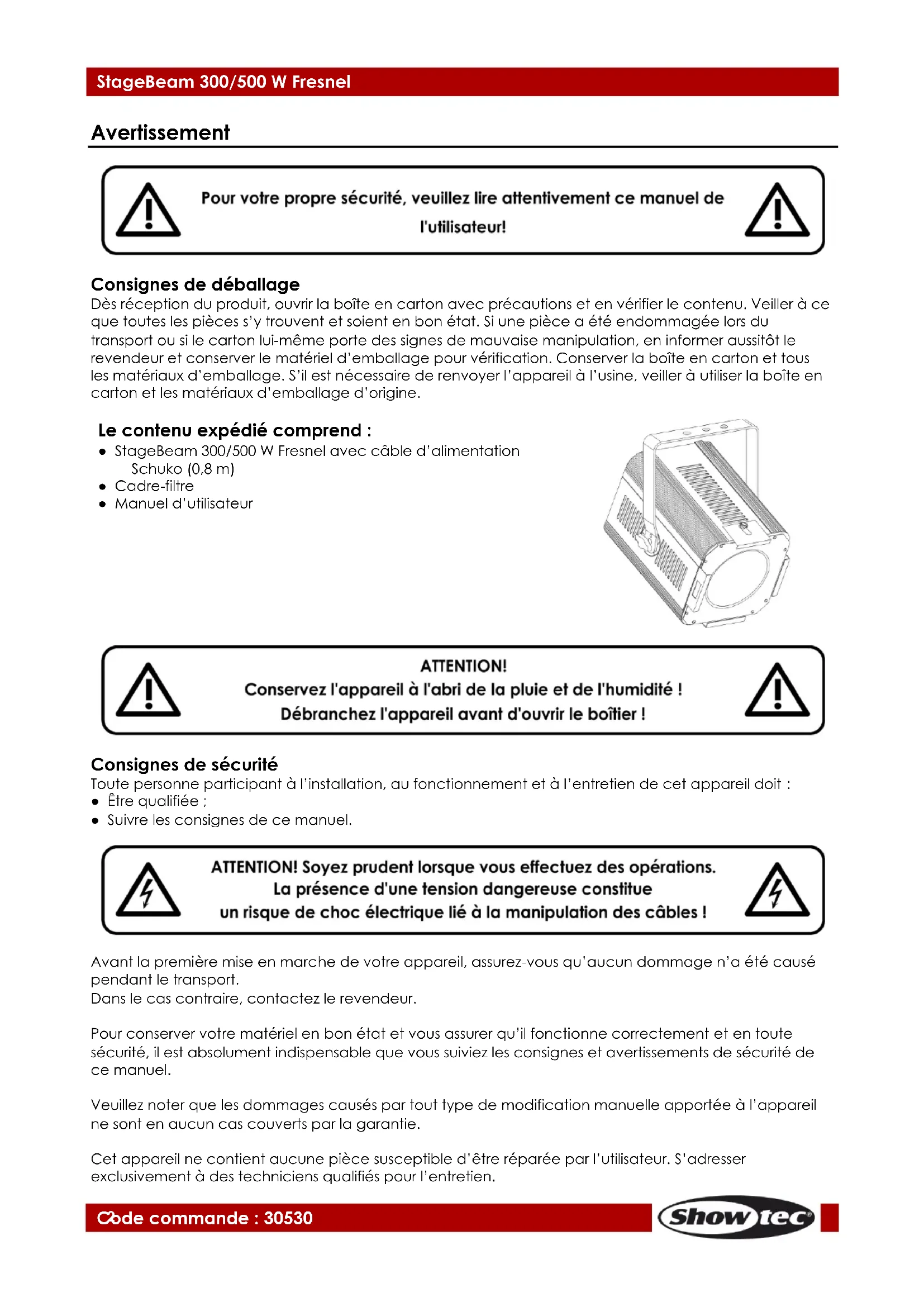 Avant la première mise en marche de votre appareil, assurez-vous qu’aucun dommage n’a été causé pendant le transport. Dans le cas contraire, contactez le revendeur. Pour conserver votre matériel en bon état et vous assurer qu’il fonctionne correctement et en toute sécurité, il est absolument indispensable que vous suiviez les consignes et avertissements de sécurité de ce manuel. Veuillez noter que les dommages causés par tout type de modification manuelle apportée à l’appareil ne sont en aucun cas couverts par la garantie. Cet appareil ne contient aucune pièce susceptible d’être réparée par l’utilisateur. S’adresser exclusivement à des techniciens qualifiés pour l’entretien.3 Code commande : 30530 StageBeam 300/500 W Fresnel IMPORTANT : Le fabricant ne sera en aucun cas tenu responsable des dommages causés par l’irrespect de ce manuel ni par toutes modifications interdites de l’appareil. ● Ne mettez jamais en contact le cordon d’alimentation avec d’autres câbles ! Manipulez le cordon d’alimentation et tous les câbles reliés au courant secteur avec une extrême prudence ! ● N’enlevez jamais l’étiquetage informatif et les avertissements indiqués sur l’appareil. ● Ne couvrez jamais le contact de masse avec quoi que ce soit. ● Ne soulevez jamais l’appareil en le maintenant par sa tête, sous peine d’abîmer le mécanisme. Maintenez-le toujours par ses poignées de transport. ● Ne placez jamais de matériaux devant la lentille. ● Ne faites jamais fonctionner l’appareil sans lampes ! ● Ne regardez jamais directement la source lumineuse. ● Ne laissez jamais traîner de câbles par terre. ● N’insérez pas d’objets dans les orifices d’aération. ● Ne connectez pas l’appareil à un bloc de puissance. ● N’allumez et n’éteignez pas l’appareil à des intervalles réduits. Vous pourriez nuire à sa longévité. ● Ne touchez pas le boîtier de l’appareil à mains nues durant le fonctionnement de celui-ci (le boîtier devient très chaud). Laissez-le refroidir au moins 5 minutes avant de le manipuler. ● Ne secouez pas l’appareil. Évitez tout geste brusque durant l’installation ou l’utilisation de l’appareil. ● Utilisez l’appareil uniquement dans des espaces intérieurs et évitez de le mettre en contact avec de l’eau ou tout autre liquide. ● Utilisez l’appareil uniquement après avoir vérifié que le boîtier est bien fermé et que les vis sont correctement serrées. ● N’utilisez l’appareil qu’une fois vous être familiarisé avec ses fonctions. ● Évitez les flammes et éloignez l’appareil des liquides ou des gaz inflammables. ● Maintenez toujours le boîtier fermé pendant l’utilisation. ● Remplace toujours la lampe quand elle est abîmée ou déformée par la chaleur. ● Veillez toujours à garder un espace minimum d’air libre de 50 cm autour de l’appareil pour favoriser sa ventilation. ● Débranchez toujours l’appareil lorsqu’il n’est pas utilisé ou avant de le nettoyer ou de remplacer une lampe ! Prenez soin de manipuler le cordon d’alimentation uniquement par sa fiche. Ne retirez jamais celle-ci en tirant sur le cordon d’alimentation. ● Assurez-vous que l’appareil n’est pas exposé à une source importante de chaleur, d’humidité ou de poussière. ● Assurez-vous que la tension disponible n’est pas supérieure à celle indiquée sur le panneau situé à l’arrière. ● Assurez-vous que le cordon d’alimentation n’est pas endommagé et ne comporte aucune éraflure. Vérifiez régulièrement l’appareil et le cordon d’alimentation. ● Si la lentille est manifestement endommagée, celle-ci doit être remplacée pour éviter que ses fonctionnalités soient altérées, à cause de brèches ou de rayures profondes. ● Si vous heurtez ou laissez tomber l’appareil, débranchez-le immédiatement de la prise. Pour des raisons de sécurité, faites inspecter l’équipement par un technicien qualifié avant de le réutiliser. ● Si l’appareil a été exposé à de grandes différences de température (par exemple après le transport), ne le branchez pas immédiatement. La condensation qui se formerait à l’intérieur de l’appareil pourrait l’endommager. Laissez l’appareil hors tension et à température ambiante. ● Si votre produit Showtec ne fonctionne pas correctement, veuillez cesser de l’utiliser immédiatement. Emballez-le correctement (de préférence dans son emballage d’origine) et renvoyez-le à votre revendeur Showtec pour révision. ● À l’usage des adultes seulement. Le projecteur doit être installé hors de portée des enfants. Ne laissez jamais l’appareil fonctionner sans surveillance. ● N’essayez pas de shunter la protection thermostatique ou les fusibles. ● En cas de remplacement, utilisez uniquement des lampes et fusibles de même type ou de même calibre/puissance. ● L’utilisateur est responsable du positionnement et du fonctionnement corrects du StageBeam. Le fabricant décline toute responsabilité en cas de dommages causés par la mauvaise utilisation ou l’installation incorrecte de cet appareil. ● Laissez le temps à votre appareil de refroidir avant de remplacer la lampe.4 Code commande : 30530 StageBeam 300/500 W Fresnel ● Cet appareil est répertorié sous la protection classe 1. Il est donc primordial de connecter le conducteur jaune / vert à la terre. ● Les réparations, maintenances et branchements électriques doivent être effectués par un technicien qualifié. ● GARANTIE : d’un (1) an à compter de la date d’achat.