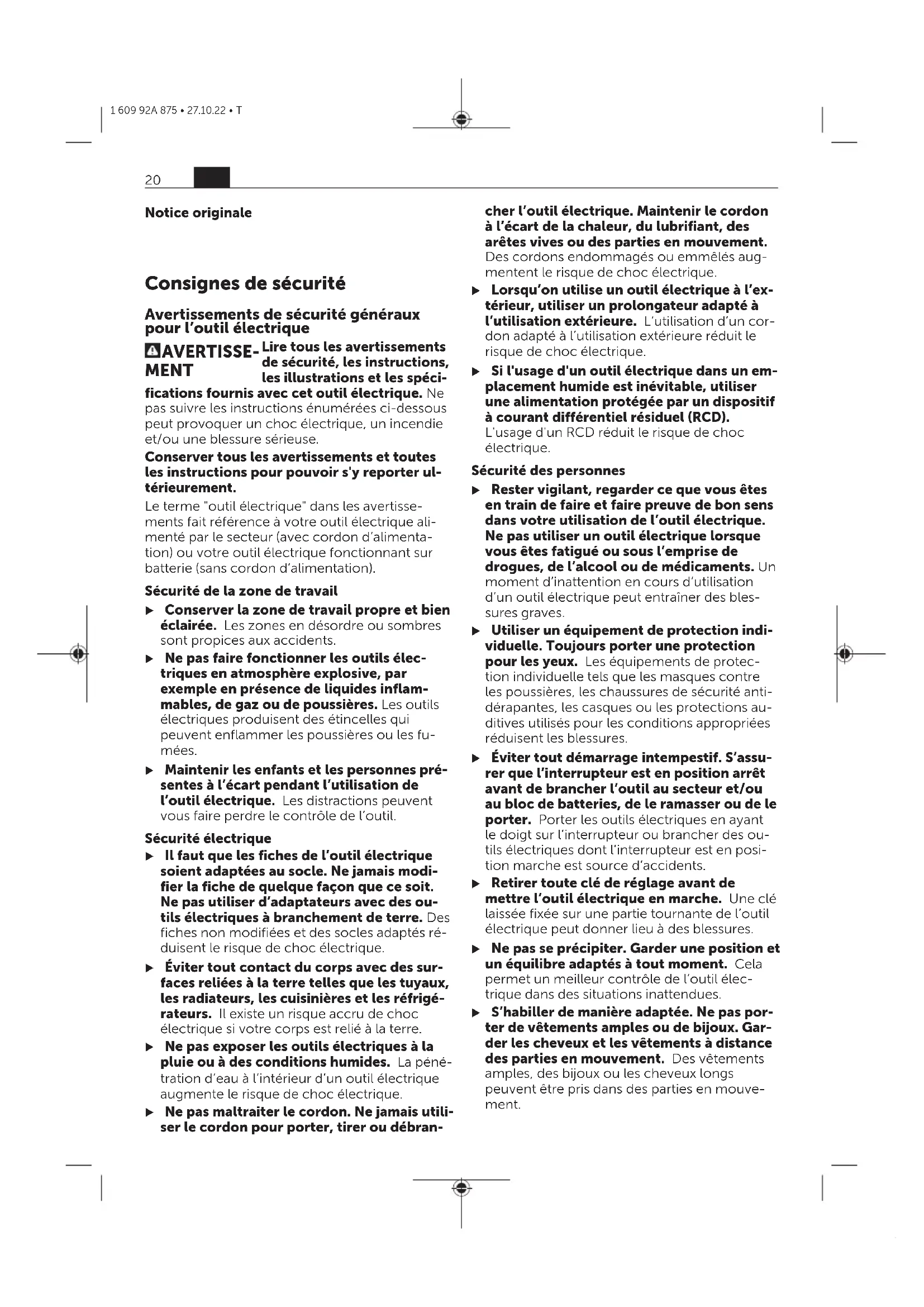 (Les valeurs indiquées pour le sciage de pan- neaux agglomérés s’appliquent pour une épais- seur de panneau de 20mm.) Le niveau de vibration et la valeur d’émission so- nore indiqués dans cette notice d’utilisation ont été mesurés selon une procédure de mesure normalisée et peuvent être utilisés pour établir une comparaison entre différents outils électro- portatifs. Ils peuvent aussi servir de base à une estimation préliminaire du taux de vibration et du niveau sonore. Le niveau de vibration et la valeur d’émission so- nore indiqués s’appliquent pour les utilisations principales de l’outil électroportatif. Si l’outil élec- troportatif est utilisé pour d’autres applications, avec d’autres accessoires de travail ou sans avoir fait l’objet d’un entretien régulier, le niveau de vi- bration et la valeur d’émission sonore peuvent différer. Il peut en résulter des vibrations et un ni- veau sonore nettement plus élevés pendant toute la durée de travail. Pour une estimation précise du niveau de vibra- tion et du niveau sonore, il faut aussi prendre en considération les périodes pendant lesquelles l’outil est éteint ou bien en marche sans être vrai- ment en action. Il peut en résulter au final un ni- veau de vibration et un niveau sonore nettement plus faibles pendant toute la durée de travail. Prévoyez des mesures de protection supplémen- taires permettant de protéger l’utilisateur de l’ef- fet des vibrations, par exemple : maintenance de fr 23 1 609 92A 875 • 27.10.22 • Tl’outil électroportatif et des accessoires de travail, maintien des mains au chaud, organisation des procédures de travail. AccuFrançais Recharge de l’accuFrançais u N’utilisez que les chargeurs indiqués dans les Caractéristiques techniques. Seuls ces chargeurs sont adaptés à l’accu Lithium-Ion de votre outil électroportatif. Remarque: Les dispositions internationales en vigueur pour le transport de marchandises obligent à livrer les accus Lithium-Ion partielle- ment chargés. Pour que les accus soient pleine- ment performants, chargez-les complètement avant leur première utilisation. Mise en place de l’accuFrançais Insérez l’accu dans le compartiment à accu jus- qu’à ce qu’il s’enclenche. Retrait de l’accuFrançais Pour retirer l’accu, appuyez sur le bouton de dé- verrouillage de l’accu et sortez l’accu de l’outil électroportatif. Ne forcez pas. L’accu dispose d’un double verrouillage permet- tant d’éviter qu’il tombe si vous appuyez par mé- garde sur le bouton de déverrouillage d’accu. Tant que l’accu est en place dans l’outil électro- portatif, un ressort le maintient en position. Indicateur de niveau de charge de l’accuFrançais Les LED vertes de l'indicateur d'état de charge in- diquent le niveau de charge de la batterie. Pour des raisons de sécurité, il n’est possible d’afficher l’état de charge que quand l’outil électroportatif est à l’arrêt. Pour afficher le niveau de charge, appuyez sur le bouton de l'indicateur de niveau de charge ou . L’affichage du niveau de charge est égale- ment possible après retrait de l’accu. Si aucune LED ne s'allume après avoir appuyé sur le bouton de l'indicateur de niveau de charge, la batterie est défectueuse et doit être remplacée. Batterie de type GBA 18V...Français LED Capacité Allumage permanent en vert de 3LED 60–100% Allumage permanent en vert de 2LED 30–60% Allumage permanent en vert de 1LED 5–30% Clignotement en vert de 1LED 0–5% Batterie de type ProCORE18V...Français LED Capacité Allumage permanent en vert de 5LED 80–100% Allumage permanent en vert de 4LED 60–80% Allumage permanent en vert de 3LED 40–60% Allumage permanent en vert de 2LED 20–40% Allumage permanent en vert de 1LED 5–20% Clignotement en vert de 1LED 0–5% Indications pour une utilisation optimale de la batterieFrançais Protégez l’accu de l’humidité et de l’eau. Ne stockez l’accu que dans la plage de tempéra- tures de –20 à 50 °C. Ne laissez par ex. pas l’accu dans une voiture en plein été. Nettoyez de temps en temps les orifices de ven- tilation de l’accu à l’aide d’un pinceau doux, propre et sec. Une baisse notable de l’autonomie de l’accu au fil des recharges effectuées indique que l’accu est arrivé en fin de vie et qu’il doit être remplacé. Respectez les indications concernant l’élimina- tion. MontageFrançais u Retirez l’accu de l’appareil électroportatif avant toute intervention (opérations d’en- tretien/de maintenance, changement d’ac- cessoire, etc.) ainsi que lors de son trans- port et rangement. Il y a sinon risque de bles- sure lorsqu’on appuie par mégarde sur l’inter- rupteur Marche/Arrêt. Montage/changement de la lame descieFrançais u Portez des gants de protection lors du montage ou du remplacement de l’acces- soire de travail. Les accessoires de travail sont tranchants et peuvent devenir chauds lors d’une utilisation prolongée de la scie. u Lors d’un changement de la lame, veillez à ce que le logement de lame soit exempt de tout résidu de matériau, parex. copeaux de bois ou de métal. Choix de la lame de scieFrançais Ne montez que des lames de scie à emmanche- ment universel 1/2". Choisissez toujours une lame pas plus longue que ne l’exige la coupe à effectuer. 24 fr 1 609 92A 875 • 27.10.22 • TMise en place de la lame de scie (voirfigureA)Français Tournez la bague de blocage(3) d’env. 90° dans le sens de la flèche et maintenez-là dans cette position. Logez la lame de scie(1) dans le porte- lame(10). Relâchez la bague de blocage. u Vérifiez que la lame est bien fixée en tirant dessus. Une lame qui a du jeu peut tomber et risque de vous blesser. Pour certains travaux, il est possible de monter la lame de scie (1) tournée de 180° (de façon à ce que les dents soient dirigées vers le haut). Retrait de la lame de scie (voirfigure