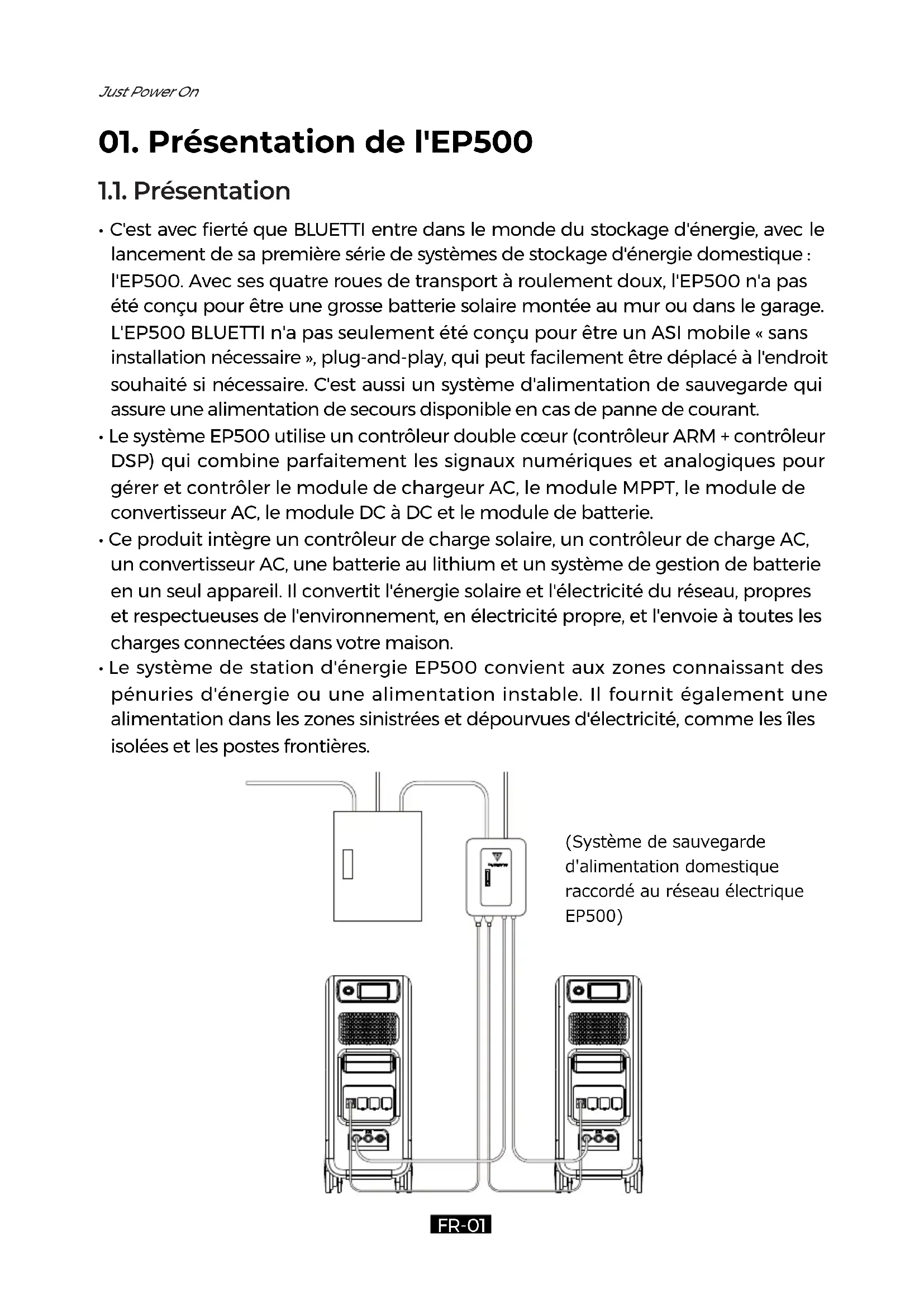 - C'est avec fierté que BLUETTI entre dans le monde du stockage d'énergie, avec le lancement de sa première série de systèmes de stockage d'énergie domestique : l'EP500. Avec ses quatre roues de transport à roulement doux, l'EP500 n'a pas été concu pour être une grossse batterie solaire montée au mur ou dans le garage. L'EP500 BLUETTI n'a pas seulement été concu pour être un ASI mobile « sans installation nécessaire », plug-and-play, qui peut facilement être déplaced à l'endroit souhaité si nécessaire. C'est aussi un système d'alimentation de sauvégarde qui assure une alimentation de secours disponible en cas de panne de courant.