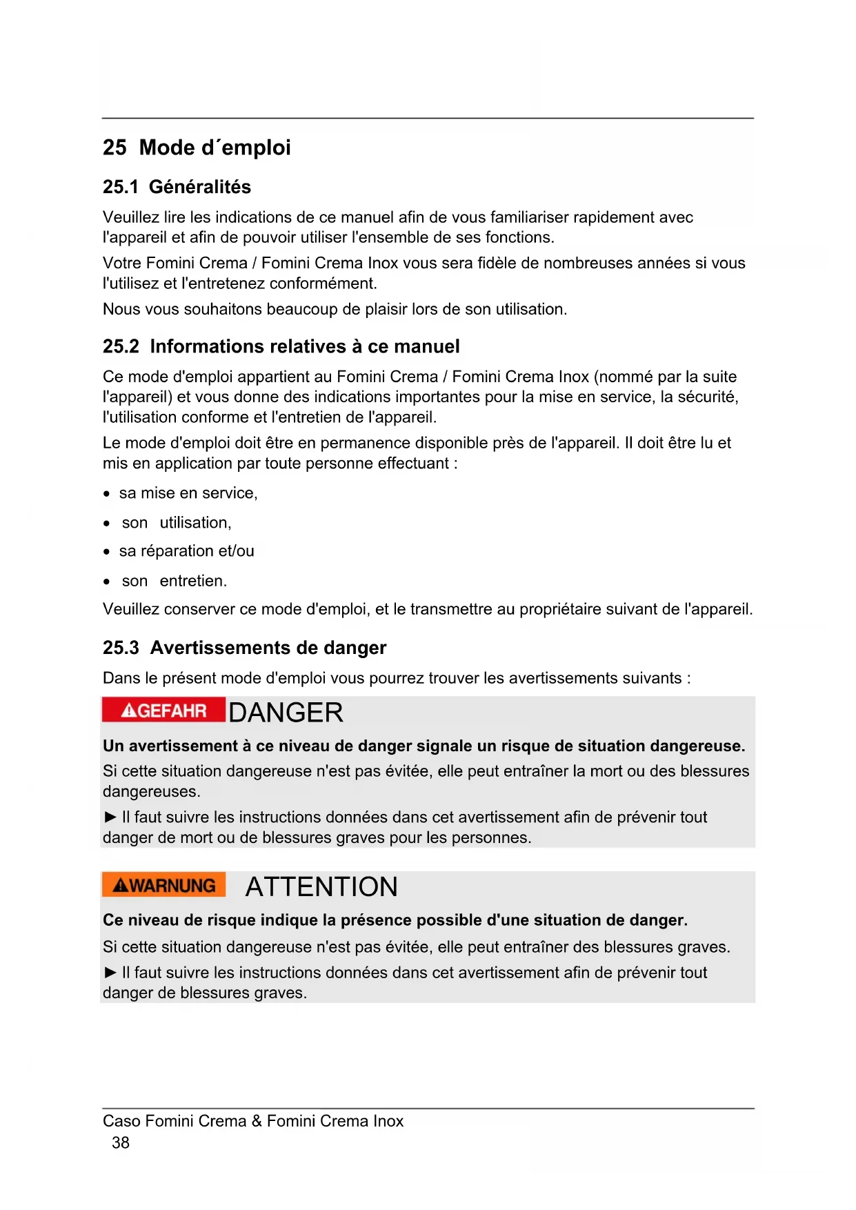Dans le présent mode d'emploi vous pourrez trouver les avertissements suivants : DANGER Un avertissement à ce niveau de danger signale un risque de situation dangereuse. Si cette situation dangereuse n'est pas évitée, elle peut entraîner la mort ou des blessures dangereuses. ► Il faut suivre les instructions données dans cet avertissement afin de prévenir tout danger de mort ou de blessures graves pour les personnes. ATTENTION Ce niveau de risque indique la présence possible d'une situation de danger. Si cette situation dangereuse n'est pas évitée, elle peut entraîner des blessures graves. ► Il faut suivre les instructions données dans cet avertissement afin de prévenir tout danger de blessures graves.Caso Fomini Crema & Fomini Crema Inox 39 PRUDENCE Ce niveau de risque indique la présence possible d'une situation de danger. Si cette situation dangereuse n'est pas évitée, elle peut entraîner des blessures légères ou superficielles. ► Il faut suivre les instructions données dans cet avertissement afin de prévenir les blessures de personnes. REMARQUE Cette indication est accompagnée d'informations complémentaires pour faciliter l'utilisation de l'appareil.