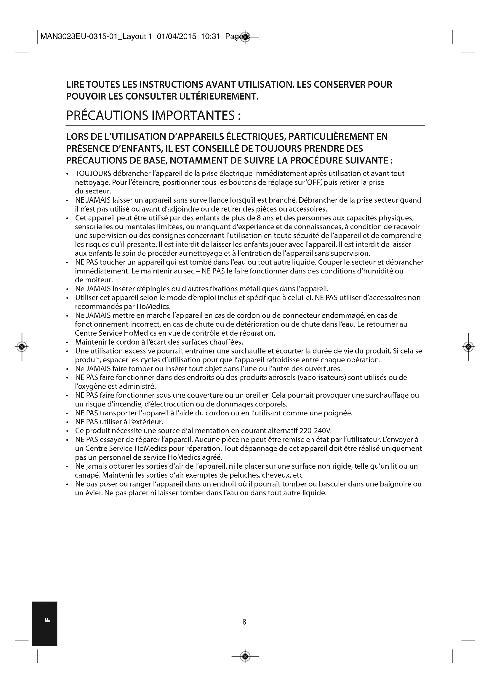 - Ne JAMAIS mettre en marche l’appareil en cas de cordon ou de connecteur endommagé, en cas de fonctionnement incorrect, en cas de chute ou de détérioration ou de chute dans l’eau. Le retourner au Centre Service HoMedics en vue de contrôle et de réparation.
