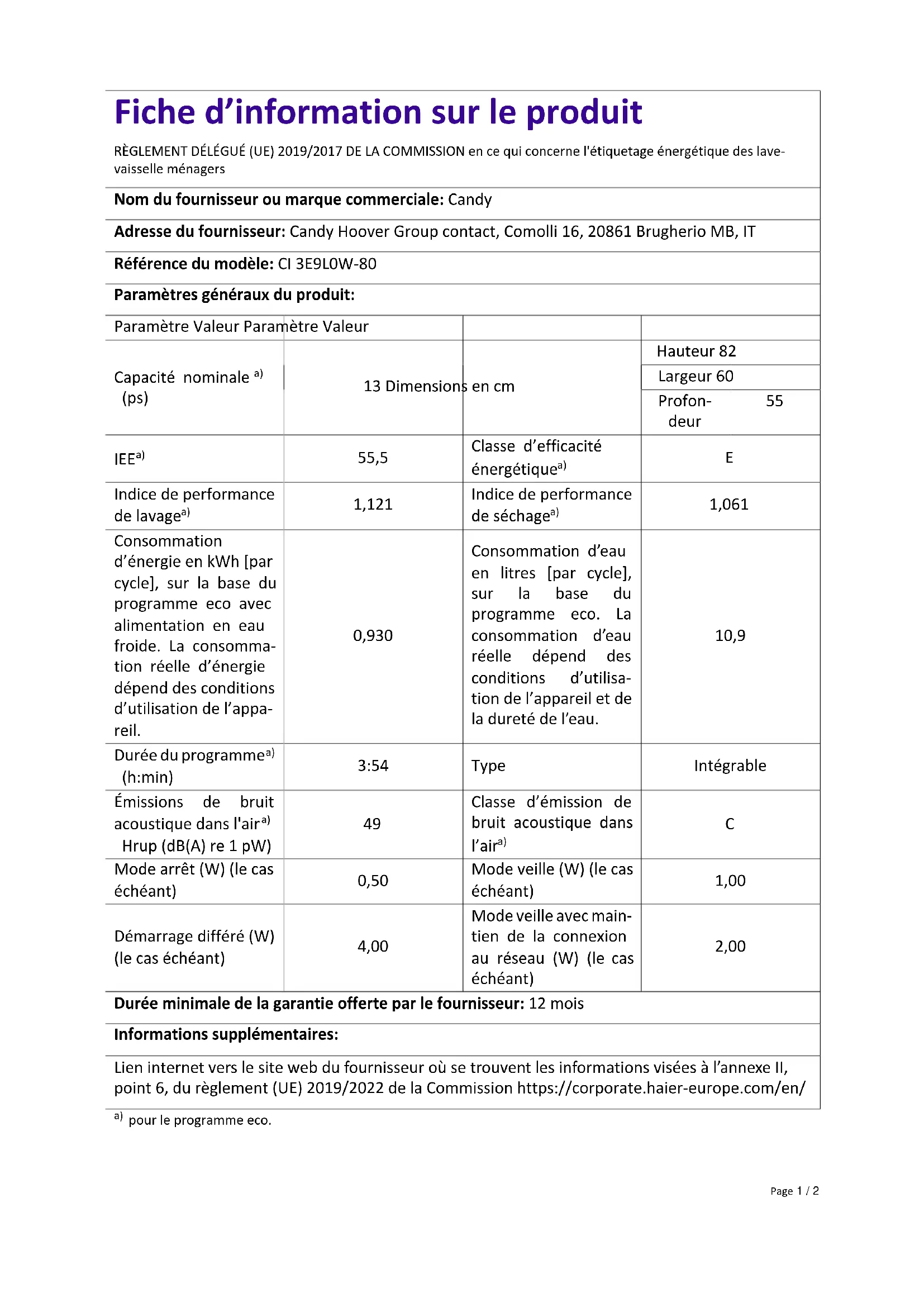 Fiche d’information sur le produit RÈGLEMENT DÉLÉGUÉ (UE) 2019/2017 DE LA COMMISSION en ce qui concerne l'étiquetage énergétique des lave- vaisselle ménagers Nom du fournisseur ou marque commerciale: Candy Adresse du fournisseur: Candy Hoover Group contact, Comolli 16, 20861 Brugherio MB, IT Référence du modèle: CI 3E9L0W-80 Paramètres généraux du produit: Paramètre Valeur Paramètre Valeur Hauteur 82 Largeur 60 Capacité nominale
