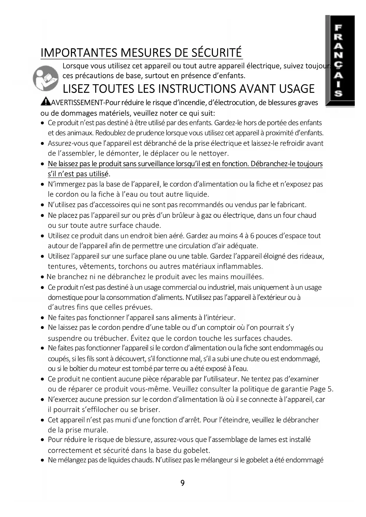 - Ne mélangez pas de liquides chauds. N’utilisez pas le mélangeur si le gobelet a été endommagé10