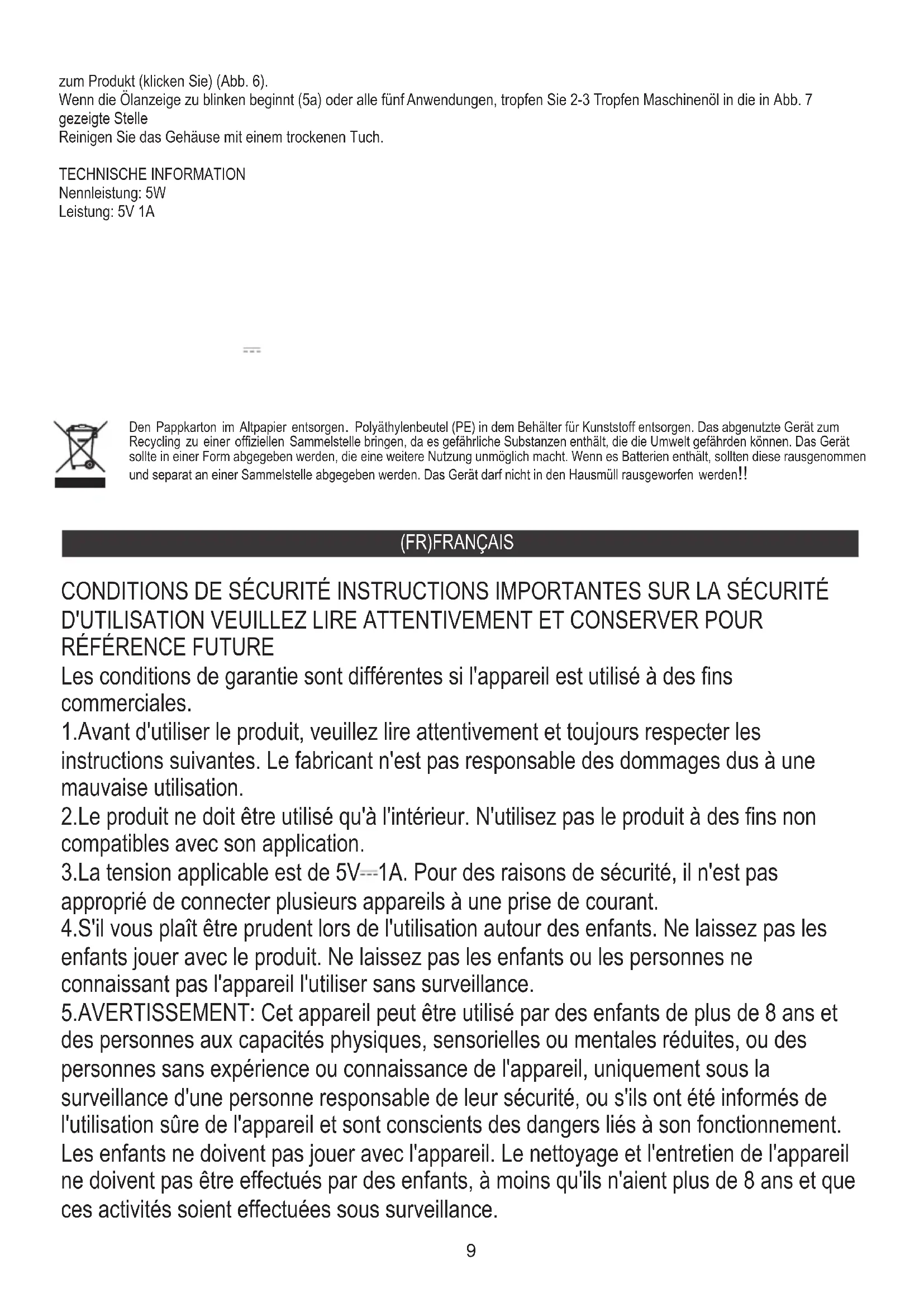 Leistung: 5V 1A Nennleistung: 5W TECHNISCHE INFORMATION Reinigen Sie das Gehäuse mit einem trockenen Tuch. Wenn die Ölanzeige zu blinken beginnt (5a) oder alle fünf Anwendungen, tropfen Sie 2-3 Tropfen Maschinenöl in die in Abb. 7 gezeigte Stelle zum Produkt (klicken Sie) (Abb. 6). Den Pappkarton im Altpapier entsorgen. Polyäthylenbeutel (PE) in dem Behälter für Kunststoff entsorgen. Das abgenutzte Gerät zum Recycling zu einer offiziellen Sammelstelle bringen, da es gefährliche Substanzen enthält, die die Umwelt gefährden können. Das Gerät sollte in einer Form abgegeben werden, die eine weitere Nutzung unmöglich macht. Wenn es Batterien enthält, sollten diese rausgenommen und separat an einer Sammelstelle abgegeben werden. Das Gerät darf nicht in den Hausmüll rausgeworfen werden!! 5.AVERTISSEMENT: Cet appareil peut être utilisé par des enfants de plus de 8 ans et des personnes aux capacités physiques, sensorielles ou mentales réduites, ou des personnes sans expérience ou connaissance de l'appareil, uniquement sous la surveillance d'une personne responsable de leur sécurité, ou s'ils ont été informés de l'utilisation sûre de l'appareil et sont conscients des dangers liés à son fonctionnement. Les enfants ne doivent pas jouer avec l'appareil. Le nettoyage et l'entretien de l'appareil ne doivent pas être effectués par des enfants, à moins qu'ils n'aient plus de 8 ans et que ces activités soient effectuées sous surveillance. 4.S'il vous plaît être prudent lors de l'utilisation autour des enfants. Ne laissez pas les enfants jouer avec le produit. Ne laissez pas les enfants ou les personnes ne connaissant pas l'appareil l'utiliser sans surveillance. 3.La tension applicable est de 5V 1A. Pour des raisons de sécurité, il n'est pas approprié de connecter plusieurs appareils à une prise de courant. 2.Le produit ne doit être utilisé qu'à l'intérieur. N'utilisez pas le produit à des fins non compatibles avec son application. 1.Avant d'utiliser le produit, veuillez lire attentivement et toujours respecter les instructions suivantes. Le fabricant n'est pas responsable des dommages dus à une mauvaise utilisation. Les conditions de garantie sont différentes si l'appareil est utilisé à des fins commerciales. CONDITIONS DE SÉCURITÉ INSTRUCTIONS IMPORTANTES SUR LA SÉCURITÉ D'UTILISATION VEUILLEZ LIRE ATTENTIVEMENT ET CONSERVER POUR