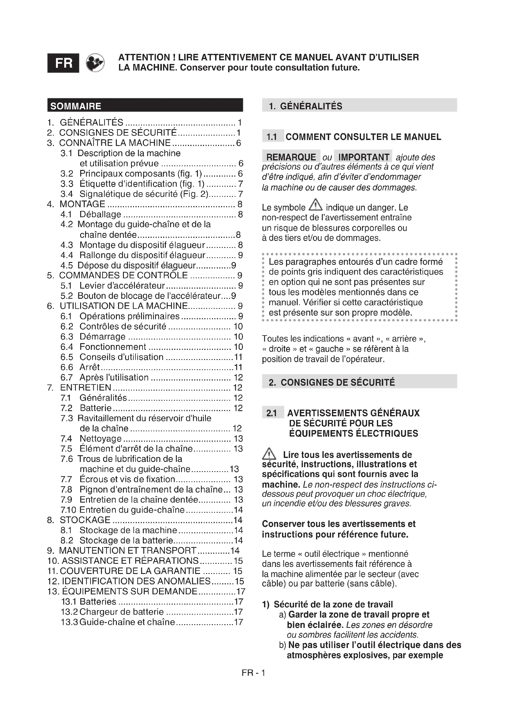 7.5 Élément d'arrêt de la chaîne.... 13