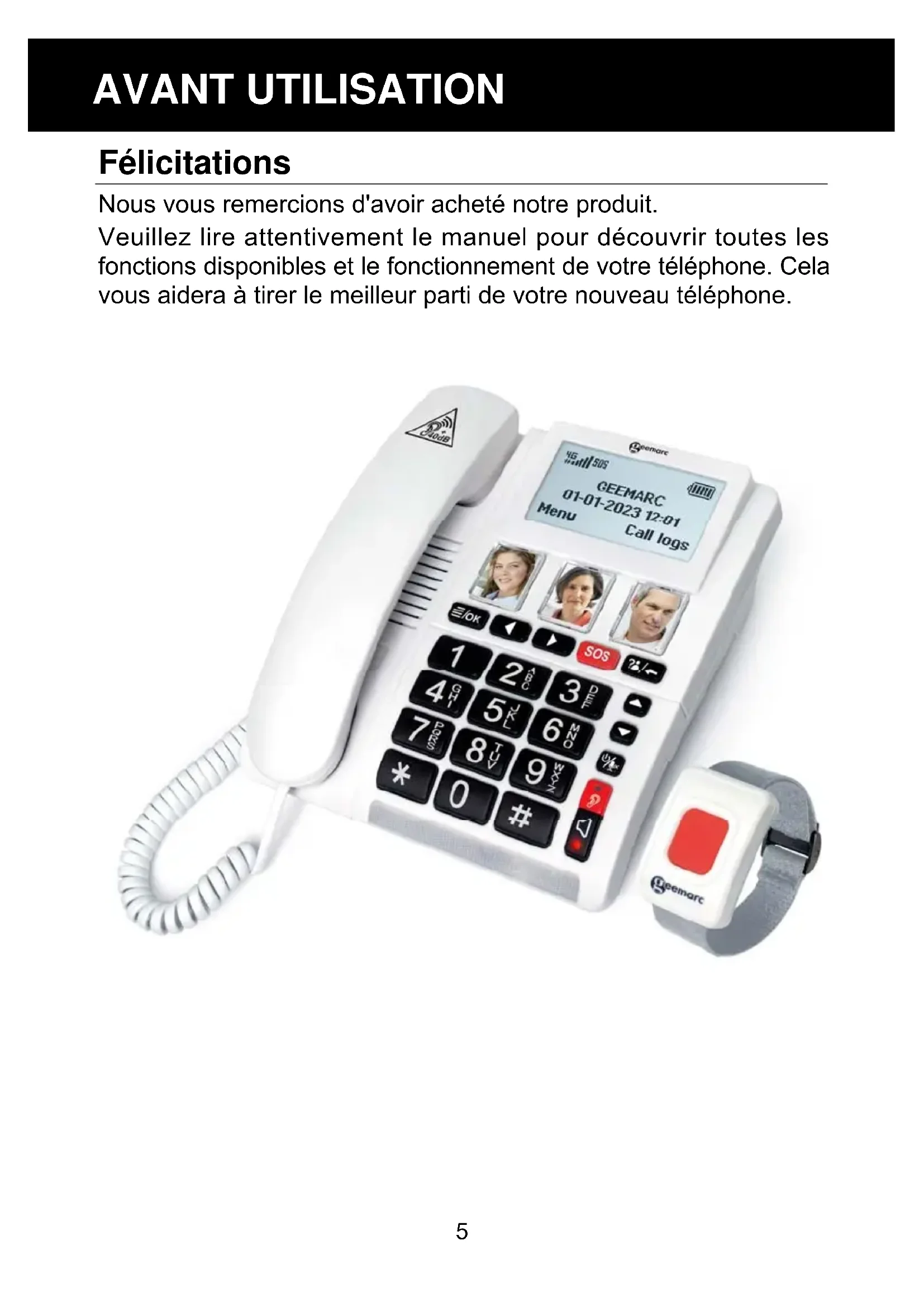Téléphone 4G avec fonction d’appel d'urgence SOS REMARQUE : Ce téléphone peut être utilisé par des personnes ayant des problèmes d'audition. Il dispose d'un combiné à volume variable allant jusqu'à 40dB. À la première utilisation, assurez - vous que le volume du combiné est réglé au minimum. La personne malentendante pourra ensuite augmenter le volume en fonction de ses besoins. Français1 Veuillez consulter notre site web: www.geemarc.com pour obtenir un guide d'utilisation actualisé, qui peut contenir des mises à jour et des changements importants dont vous devez être informé !