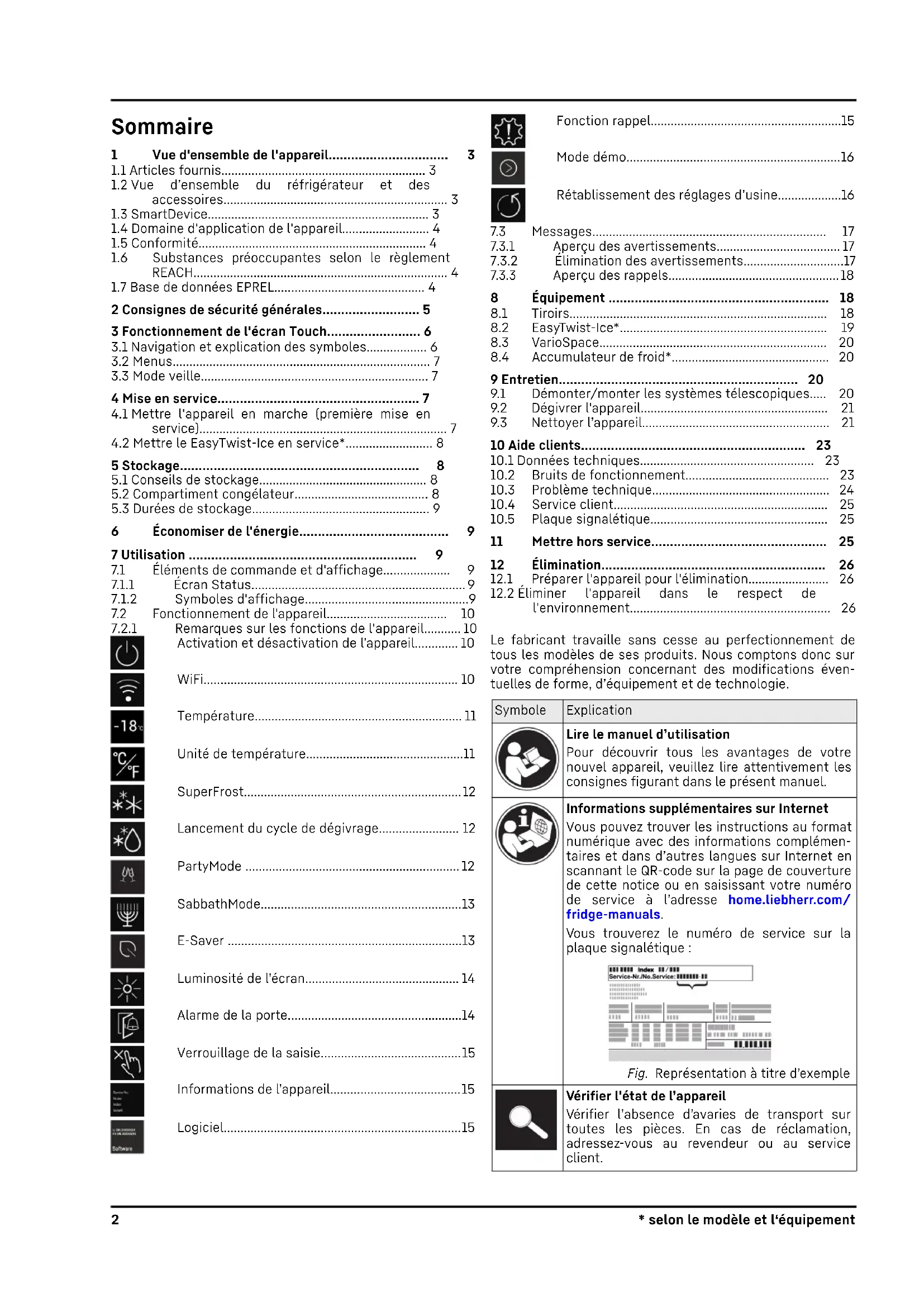 l'environnement............................................................ 26 Le fabricant travaille sans cesse au perfectionnement de tous les modèles de ses produits. Nous comptons donc sur votre compréhension concernant des modifications éven‐ tuelles de forme, d’équipement et de technologie. Symbole Explication Lire le manuel d’utilisation Pour découvrir tous les avantages de votre nouvel appareil, veuillez lire attentivement les consignes figurant dans le présent manuel. Informations supplémentaires sur Internet Vous pouvez trouver les instructions au format numérique avec des informations complémen‐ taires et dans d’autres langues sur Internet en scannant le QR-code sur la page de couverture de cette notice ou en saisissant votre numéro de service à l’adresse home.liebherr.com/ fridge-manuals. Vous trouverez le numéro de service sur la plaque signalétique: Fig.Représentation à titre d’exemple Vérifier l'état de l’appareil Vérifier l’absence d’avaries de transport sur toutes les pièces. En cas de réclamation, adressez-vous au revendeur ou au service client. 2 * selon le modèle et l‘équipementSymbole ExplicationDivergencesLe manuel d’utilisation est valable pourplusieurs modèles. Des divergences sontdonc possibles. Les paragraphes concernantuniquement un certain type d'appareils sontindiqués par un astérisque (*).Instructions et résultatsLes instructions sont indiquées par .Les résultats sont indiqués par .VidéosLes vidéos des appareils sont disponibles surla chaîne YouTube de Liebherr-Hausgeräte.Cette notice d’utilisation est valable pour: FN.. 42.. / 46.. / 50.. / 52..(i) / 66.. / 70.. / 72..SFN.. 52..GN 42Ve04 / 46Ve05 / 50Ve06 / 52Ve07 / 42Vd24 /46Vd25 / 50Vd26 / 52Vd2iSGN 52Vd27RemarqueSi la désignation de votre appareil comporte un N, il s’agitd’un appareil NoFrost. 1 Vue d'ensemble de l'appareil
