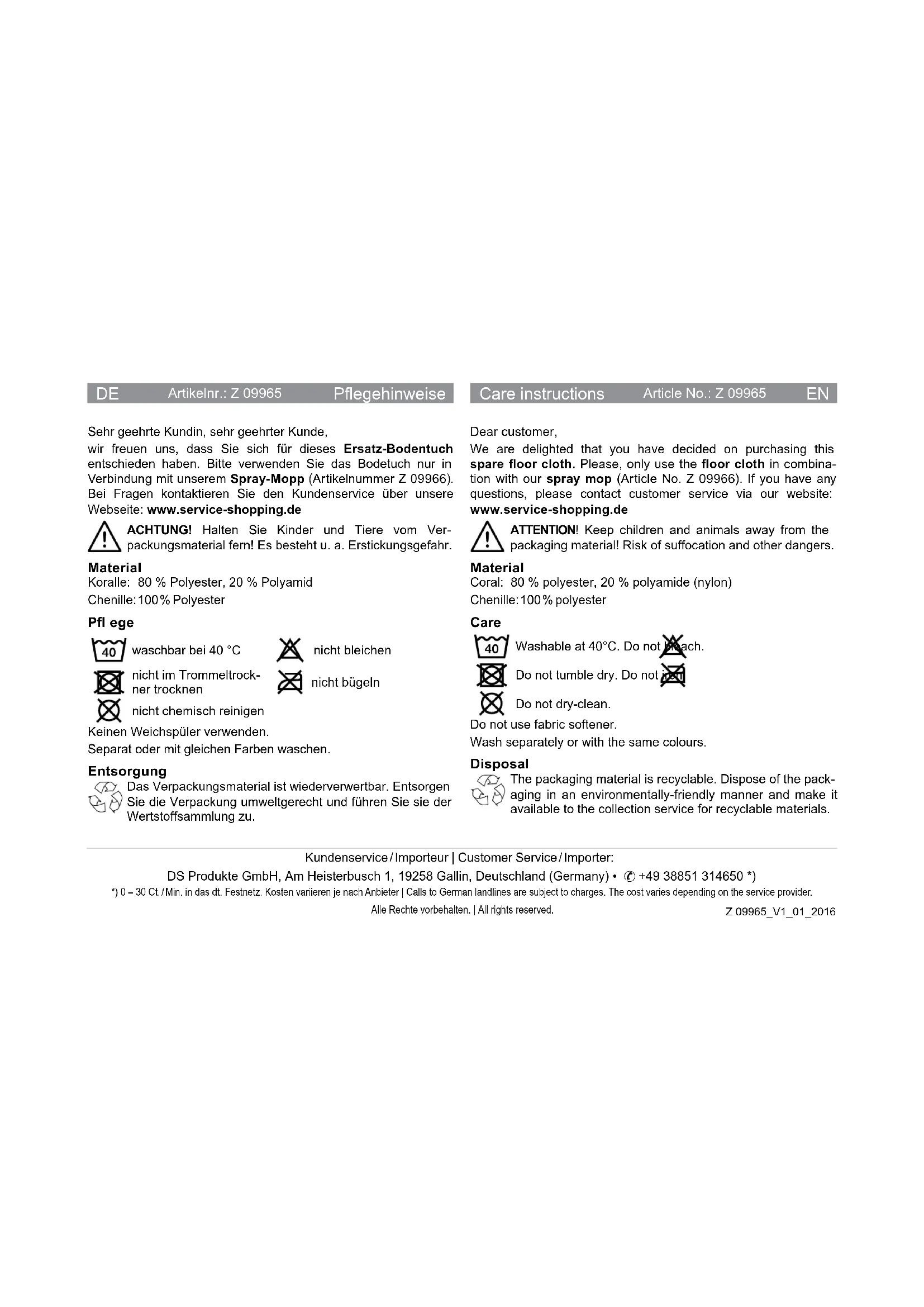Nous nous réjouissons que vous ayez décidé d'acheter cette lingette de remplacement. Utilisez la lingette uniquement en combinaison avec notre balai vaporisateur (Réf. d'article Z 09966). Si vous avez des questions, veuillez vous adress après-vente sur notre site Internet : www.service-shopping.de