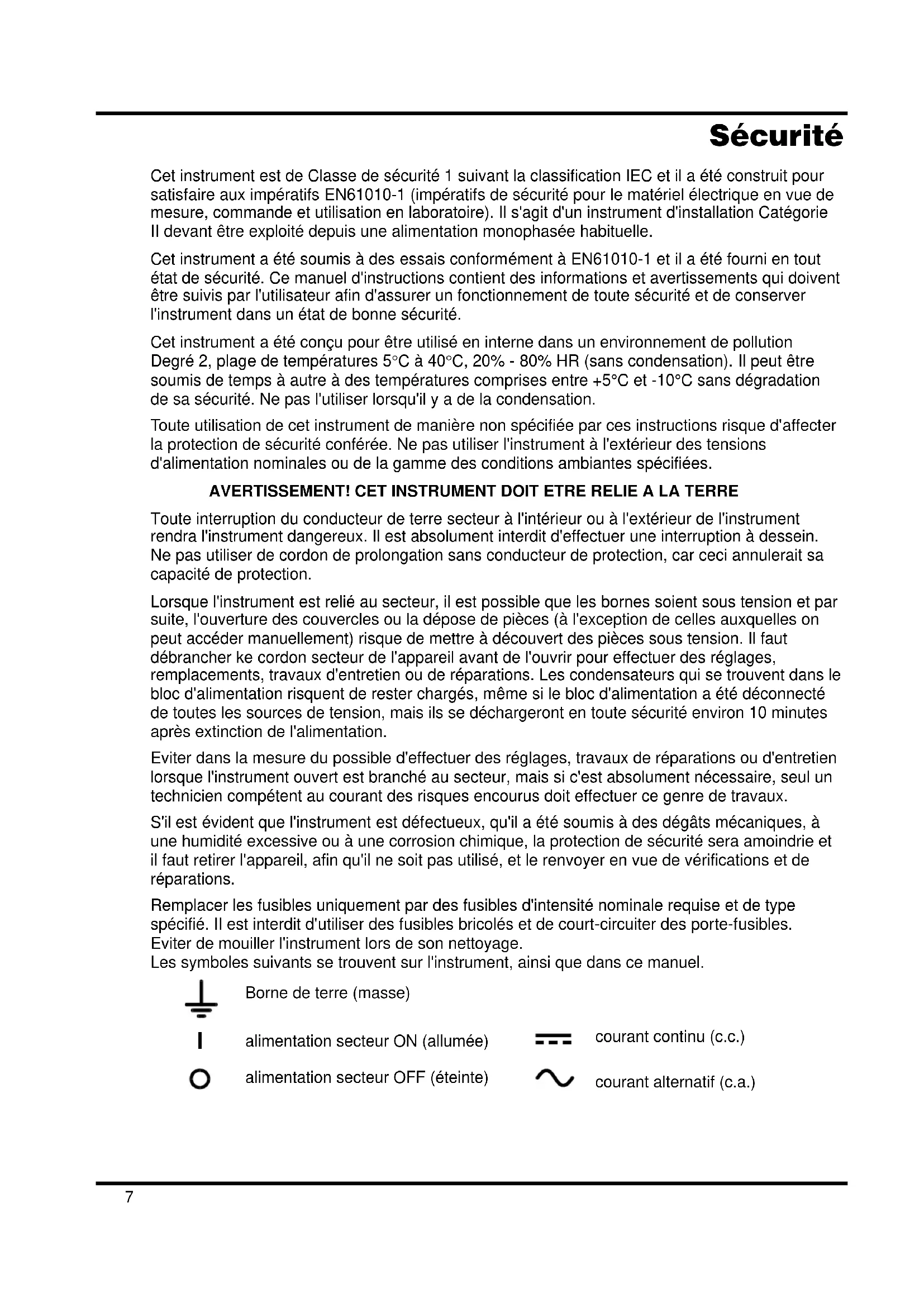 Cet instrument est de Classe de sécurité 1 suivant la classification IEC et il a ete construit pour satisfaire aux impereatifs EN61010-1 (impereatifs de sécurité pour le materiel electrique en vue de mesure, commande et utilisation en laboratoire). Il s'agit d'un instrument d'installation Categorie Il devant etre exploite depuis une alimentation monophasee habituelle.