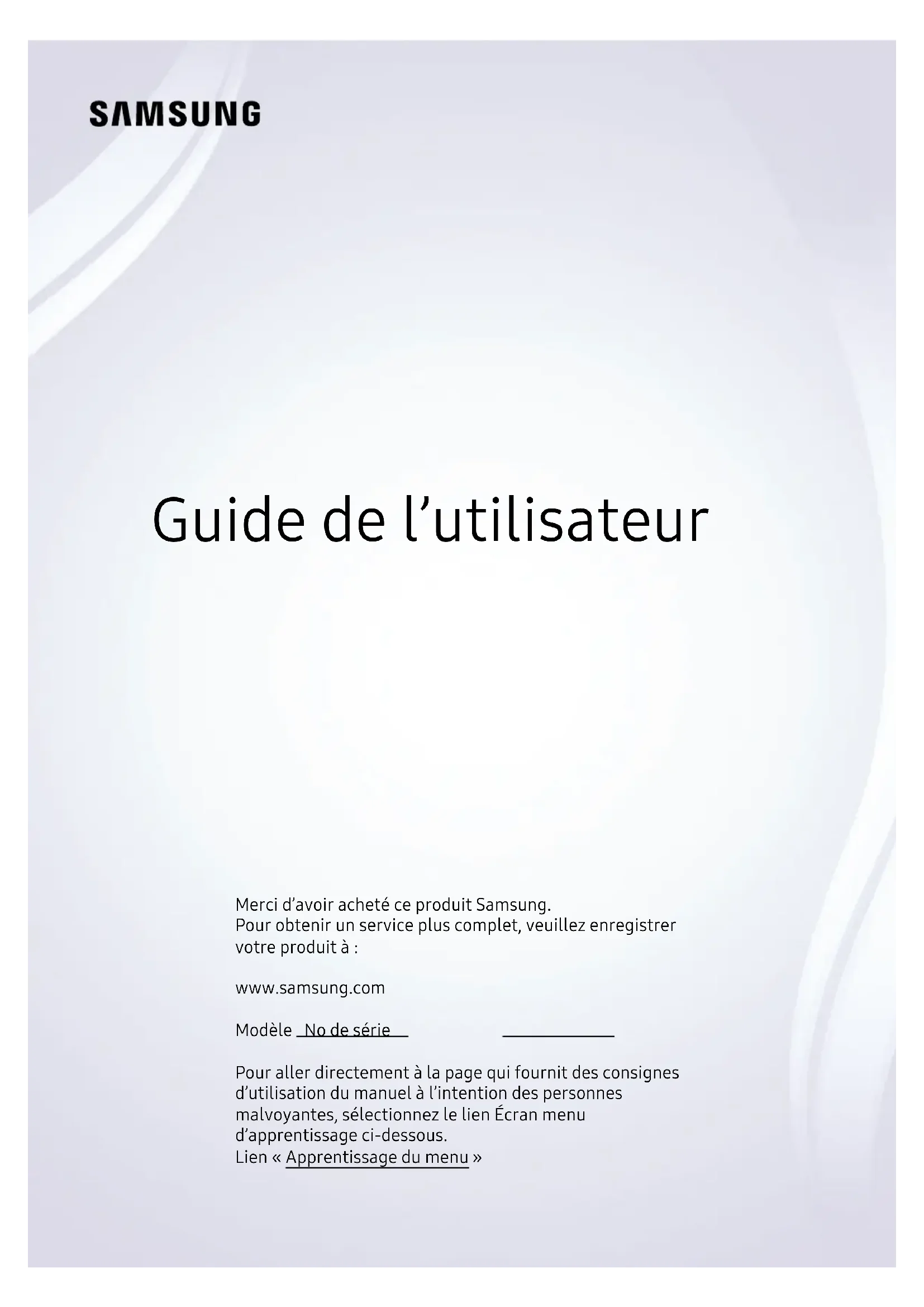 Guide de l’utilisateur Merci d’avoir acheté ce produit Samsung. Pour obtenir un service plus complet, veuillez enregistrer votre produit à : www.samsung.com Modèle No de série Pour aller directement à la page qui fournit des consignes d’utilisation du manuel à l’intention des personnes malvoyantes, sélectionnez le lien Écran menu d’apprentissage ci-dessous. Lien « Apprentissage du menu »Table des matières Guide Connexions