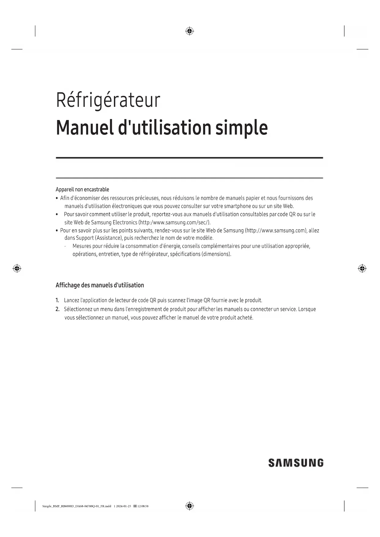 vous sélectionnez un manuel, vous pouvez afficher le manuel de votre produit acheté. Simple_BMF_RB6000D_DA68-04780Q-01_FR.indd 1 2024-01-25 12:08:58Sommaire2 Français Sommaire Consignes de sécurité 3 Mesures importantes de sécurité 4 Instructions concernant la règlementation DEEE 8 Guide de sécurité 8 Installation 10 Présentation rapide du réfrigérateur 10 Dégagement 11 Étiquette de température (modèles applicables uniquement) 12 Installation étape par étape 13 Opérations 15 SmartThings 15 Entretien 17 Nettoyage 17