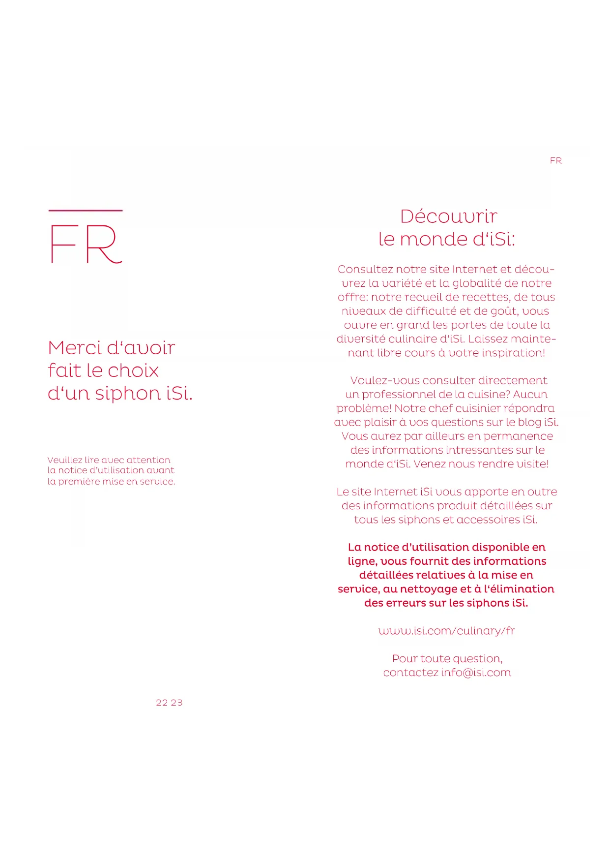 ——— Befülltes und betriebsbereites iSi Gerät für 1-2 Stunden in den Kühlschrank geben. Hinweise auf der Sahneverpackung DE22 23 Découvrir le monde d‘iSi: Consultez notre site Internet et décou- vrez la variété et la globalité de notre offre: notre recueil de recettes, de tous niveaux de difficulté et de goût, vous ouvre en grand les portes de toute la diversité culinaire d‘iSi. Laissez mainte- nant libre cours à votre inspiration! Voulez-vous consulter directement un professionnel de la cuisine? Aucun problème! Notre chef cuisinier répondra avec plaisir à vos questions sur le blog iSi. Vous aurez par ailleurs en permanence des informations intressantes sur le monde d‘iSi. Venez nous rendre visite! Le site Internet iSi vous apporte en outre des informations produit détaillées sur tous les siphons et accessoires iSi. La notice d’utilisation disponible en ligne, vous fournit des informations détaillées relatives à la mise en service, au nettoyage et à l‘élimination des erreurs sur les siphons iSi. www.isi.com/culinary/fr Pour toute question, contactez info@isi.com