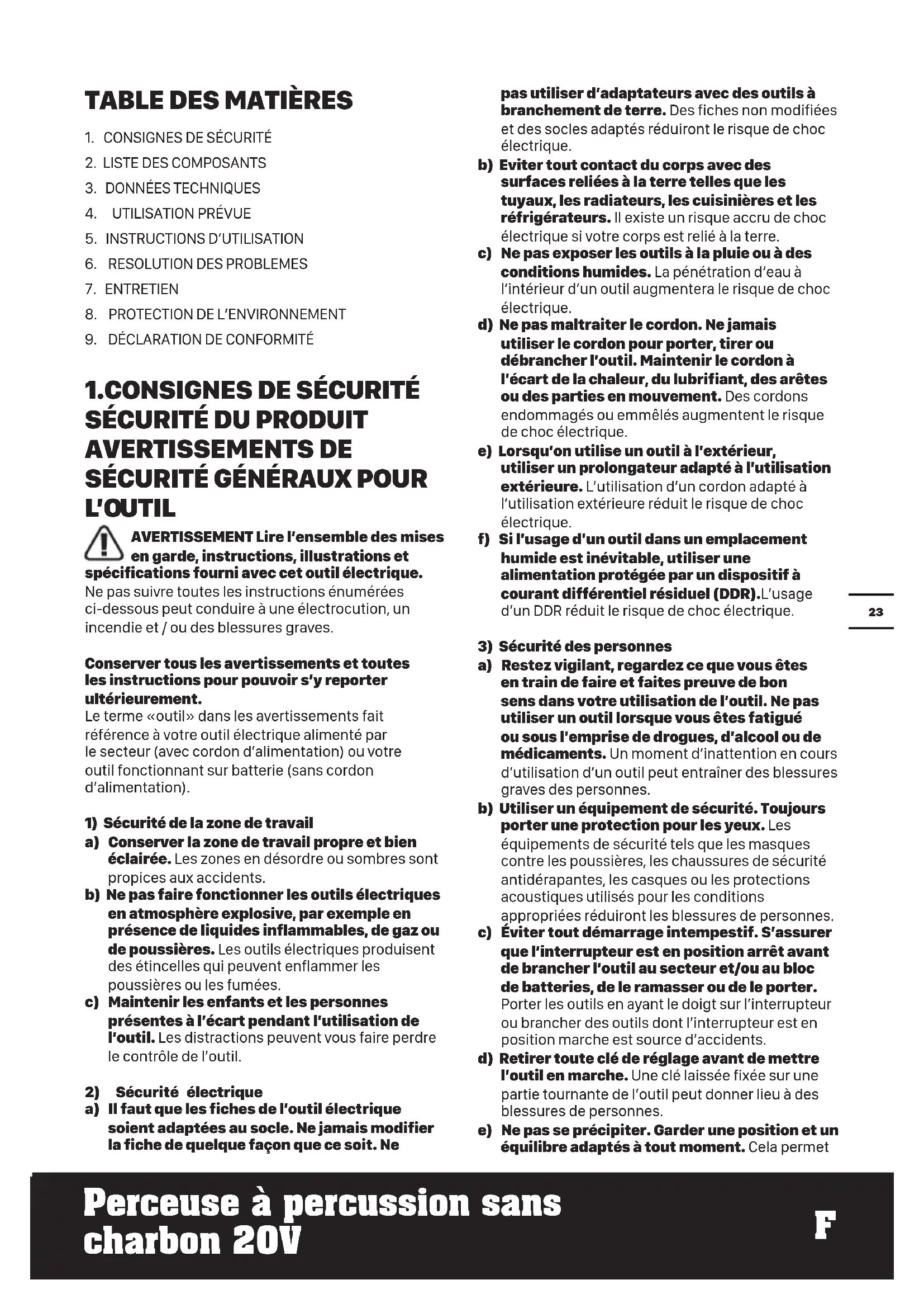 a) Restez vigilant, regardez ce que vous êtes en train de faire et faites preuve de bon sens dans votre utilisation de l’outil. Ne pas utiliser un outil lorsque vous êtes fatigué ou sous l’emprise de drogues, d’alcool ou de médicaments. Un moment d’inattention en cours d’utilisation d’un outil peut entraîner des blessures graves des personnes. b) Utiliser un équipement de sécurité. Toujours porter une protection pour les yeux. Les équipements de sécurité tels que les masques contre les poussières, les chaussures de sécurité antidérapantes, les casques ou les protections acoustiques utilisés pour les conditions appropriées réduiront les blessures de personnes. c) Éviter tout démarrage intempestif. S’assurer que l’interrupteur est en position arrêt avant de brancher l’outil au secteur et/ou au bloc de batteries, de le ramasser ou de le porter. Porter les outils en ayant le doigt sur l’interrupteur ou brancher des outils dont l’interrupteur est en position marche est source d’accidents. d) Retirer toute clé de réglage avant de mettre l’outil en marche. Une clé laissée fixée sur une partie tournante de l’outil peut donner lieu à des blessures de personnes. e) Ne pas se précipiter. Garder une position et un équilibre adaptés à tout moment. Cela permet24 Perceuse à percussion sans charbon 20V