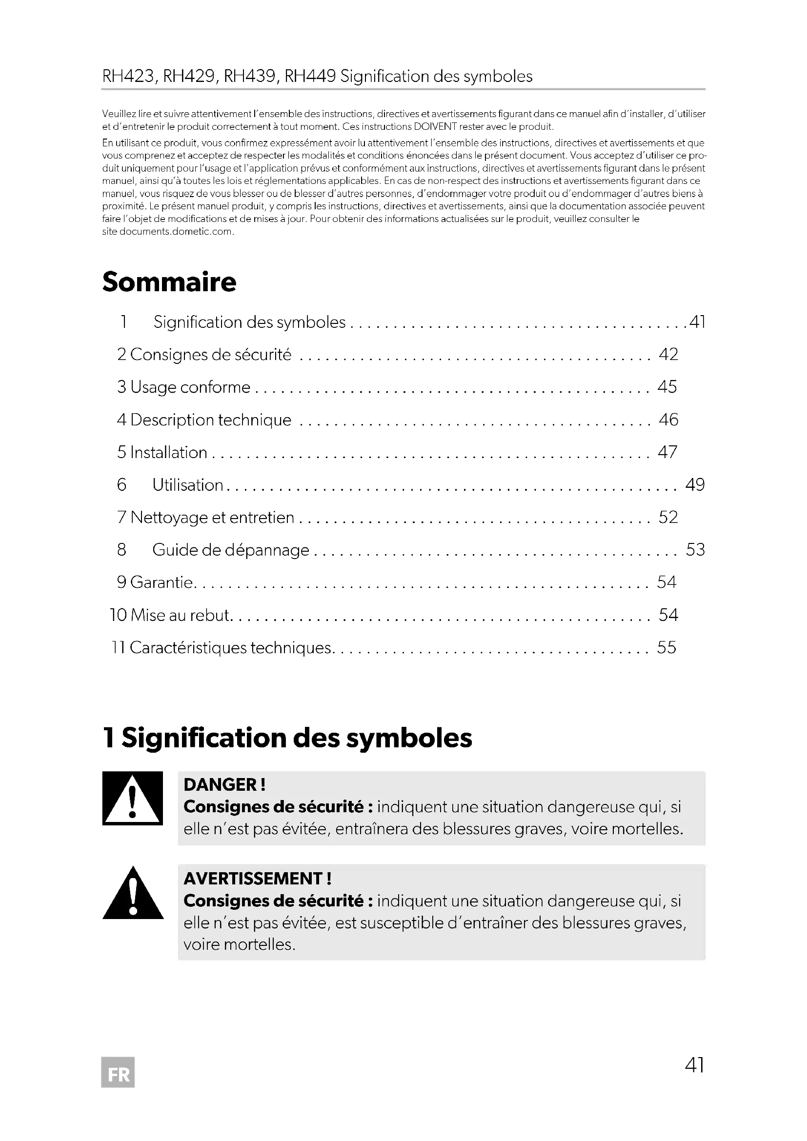 - Veuillez lire et suivre attentivement l’ensemble des instructions, directives et avertissements figurant dans ce manuel afin d’installer, d’utiliser et d’entretenir le produit correctement à tout moment. Ces instructions DOIVENT rester avec le produit. En utilisant ce produit, vous confirmez expressément avoir lu attentivement l’ensemble des instructions, directives et avertissements et que vous comprenez et acceptez de respecter les modalités et conditions énoncées dans le présent document. Vous acceptez d’utiliser ce pro- duit uniquement pour l’usage et l’application prévus et conformément aux instructions, directives et avertissements figurant dans le présent manuel, ainsi qu’à toutes les lois et réglementations applicables. En cas de non-respect des instructions et avertissements figurant dans ce manuel, vous risquez de vous blesser ou de blesser d’autres personnes, d’endommager votre produit ou d’endommager d’autres biens à proximité. Le présent manuel produit, y compris les instructions, directives et avertissements, ainsi que la documentation associée peuvent faire l’objet de modifications et de mises à jour. Pour obtenir des informations actualisées sur le produit, veuillez consulter le site documents.dometic.com. Sommaire 1 Signification des symboles p. 41