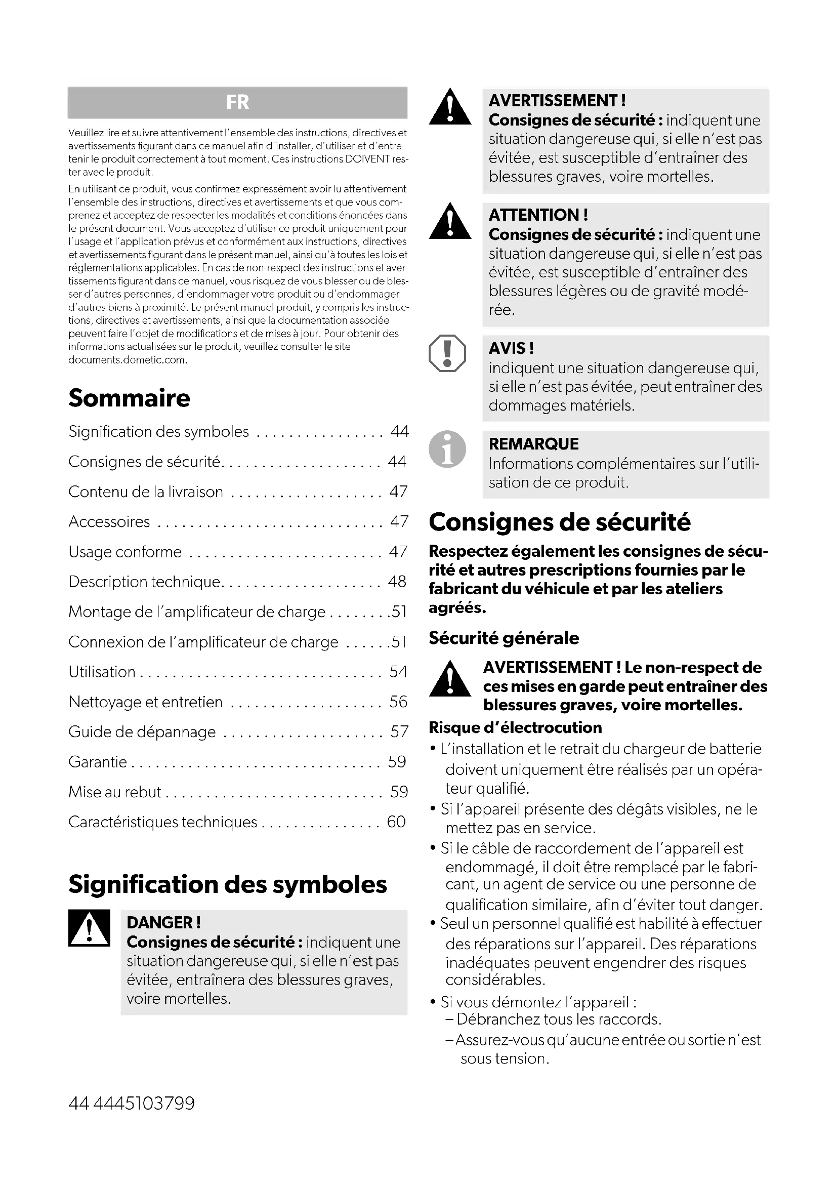 - Veuillez lire et suivre attentivement l’ensemble des instructions, directives et avertissements figurant dans ce manuel afin d’installer, d’utiliser et d’entre-tenir le produit correctement à tout moment. Ces instructions DOIVENT res-ter avec le produit.En utilisant ce produit, vous confirmez expressément avoir lu attentivement l’ensemble des instructions, directives et avertissements et que vous com-prenez et acceptez de respecter les modalités et conditions énoncées dans le présent document. Vous acceptez d’utiliser ce produit uniquement pour l’usage et l’application prévus et conformément aux instructions, directives et avertissements figurant dans le présent manuel, ainsi qu’à toutes les lois et réglementations applicables. En cas de non-respect des instructions et aver-tissements figurant dans ce manuel, vous risquez de vous blesser ou de bles- ser d’autres personnes, d’endommager votre produit ou d’endommager d’autres biens à proximité. Le présent manuel produit, y compris les instruc-tions, directives et avertissements, ainsi que la documentation associée peuvent faire l’objet de modifications et de mises à jour. Pour obtenir des informations actualisées sur le produit, veuillez consulter le site documents.dometic.com. Sommaire Signification des symboles p. 44