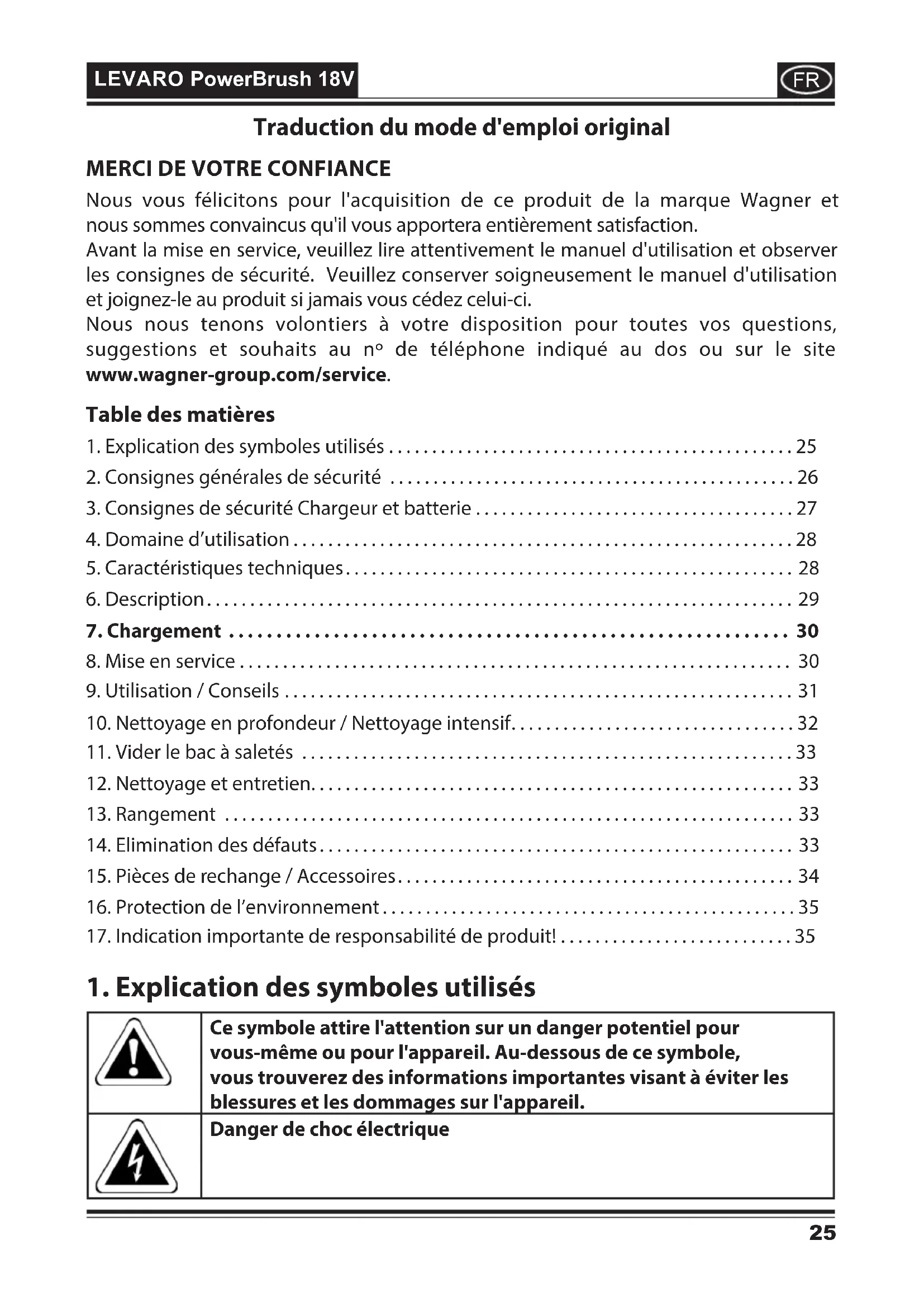 Nous vous félicitons pour l'acquisition de ce produit de la marque Wagner et nous sommes convaincus qu'il vous apportera entièrement satisfaction. Avant la mise en service, veuillez lire attentivement le manuel d'utilisation et observer les consignes de sécurité. Veuillez conserver soigneusement le manuel d'utilisation et joignez-le au produit si jamais vous cédez celui-ci. Nous nous tenons volontiers à votre disposition pour toutes vos questions, suggestions et souhaits au nº de téléphone indiqué au dos ou sur le site www.wagner-group.com/service.FR