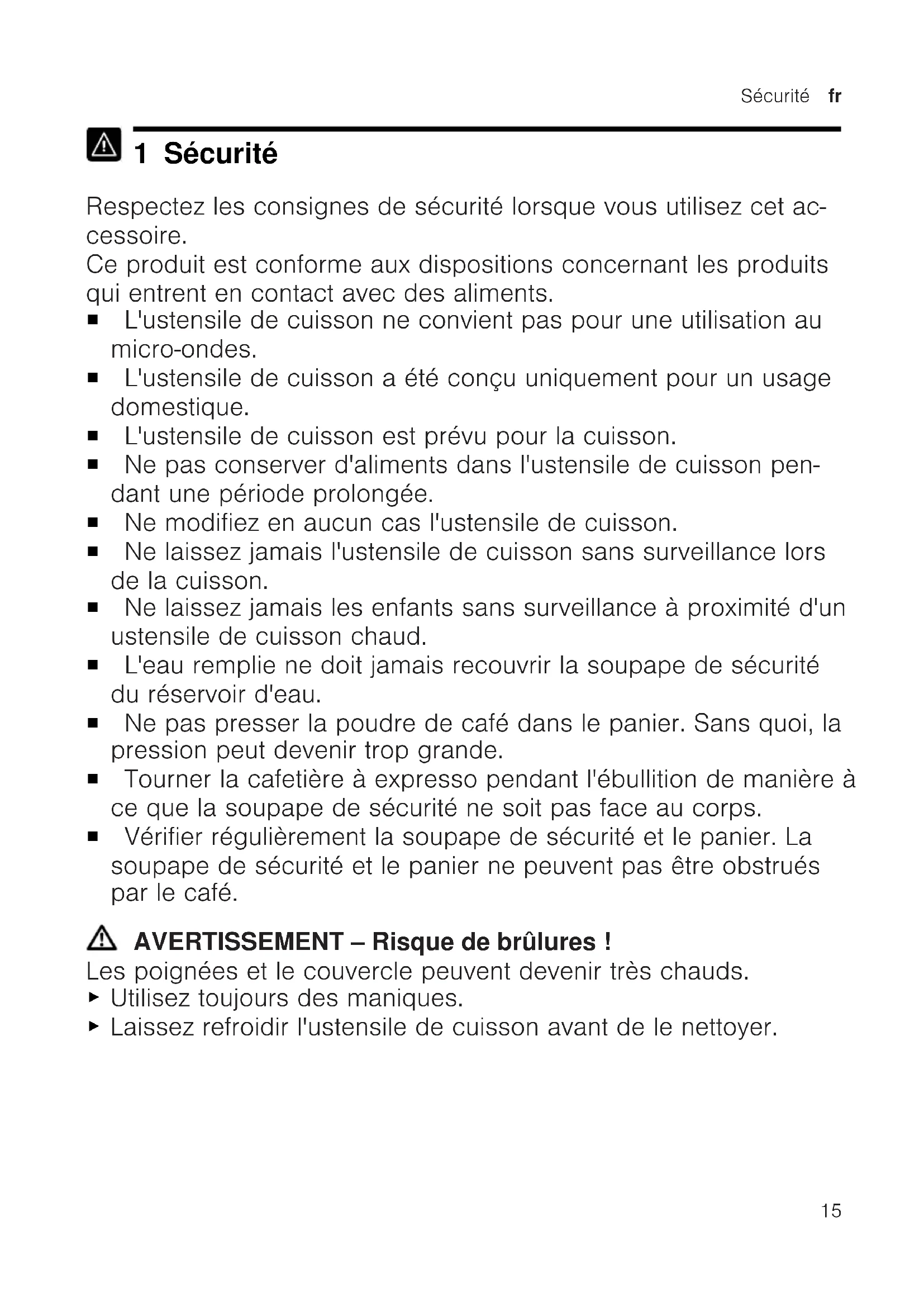 1 Sécurité Respectez les consignes de sécurité lorsque vous utilisez cet ac- cessoire. Ce produit est conforme aux dispositions concernant les produits qui entrent en contact avec des aliments. ¡ L'ustensile de cuisson ne convient pas pour une utilisation au micro-ondes. ¡ L'ustensile de cuisson a été conçu uniquement pour un usage domestique. ¡ L'ustensile de cuisson est prévu pour la cuisson. ¡ Ne pas conserver d'aliments dans l'ustensile de cuisson pen- dant une période prolongée. ¡ Ne modifiez en aucun cas l'ustensile de cuisson. ¡ Ne laissez jamais l'ustensile de cuisson sans surveillance lors de la cuisson. ¡ Ne laissez jamais les enfants sans surveillance à proximité d'un ustensile de cuisson chaud. ¡ L'eau remplie ne doit jamais recouvrir la soupape de sécurité du réservoir d'eau. ¡ Ne pas presser la poudre de café dans le panier. Sans quoi, la pression peut devenir trop grande. ¡ Tourner la cafetière à expresso pendant l'ébullition de manière à ce que la soupape de sécurité ne soit pas face au corps. ¡ Vérifier régulièrement la soupape de sécurité et le panier. La soupape de sécurité et le panier ne peuvent pas être obstrués par le café. AVERTISSEMENT‒Risque de brûlures! Les poignées et le couvercle peuvent devenir très chauds. ▶ Utilisez toujours des maniques. ▶ Laissez refroidir l'ustensile de cuisson avant de le nettoyer.fr Sécurité
