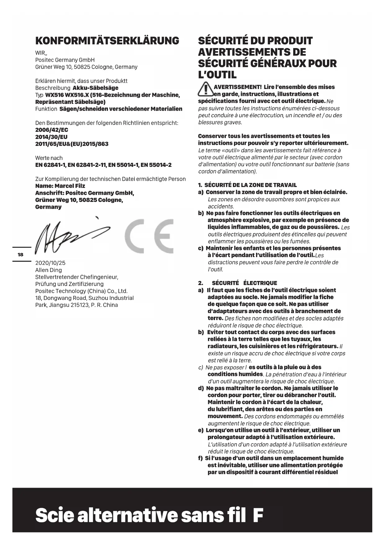 existe un risque accru de choc électrique si votre corps est relié à la terre. c) Ne pas exposer l es outils à la pluie ou à des conditions humides . La pénétration d‘eau à l’intérieur d’un outil augmentera le risque de choc électrique. d) Ne pas maltraiter le cordon. Ne jamais utiliser le cordon pour porter, tirer ou débrancher l’outil. Maintenir le cordon à l’écart de la chaleur, du lubrifiant, des arêtes ou des parties en mouvement. Des cordons endommagés ou emmêlés augmentent le risque de choc électrique. e) Lorsqu’on utilise un outil à l’extérieur, utiliser un prolongateur adapté à l’utilisation extérieure. L’utilisation d’un cordon adapté à l’utilisation extérieure réduit le risque de choc électrique. f) Si l’usage d’un outil dans un emplacement humide est inévitable, utiliser une alimentation protégée par un dispositif à courant différentiel résiduelScie alternative sans fil F